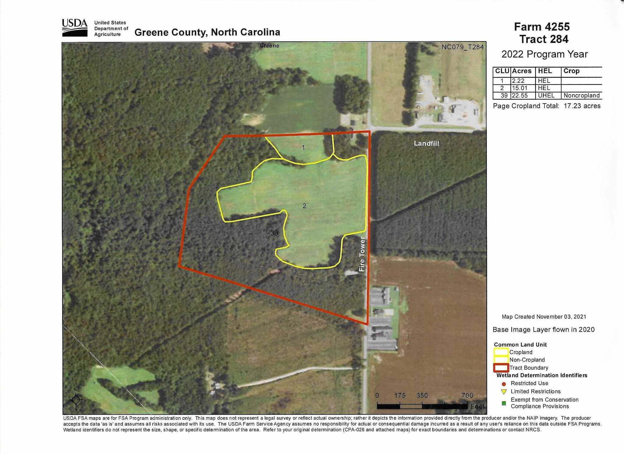 33.83 Acres, as shown as Tract 3-A on attached survey map located in the Castoria community of Greene County. This tract has 827 +/- feet of paved highway frontage on Fire Tower Road. Great tract for a mini farm or horse farm. Located within a 30 minute drive of Greenville, Goldsboro, Kinston and Wilson, NC. The tract is only 5 minutes from Greene Central High School and Lenoir Community College Greene County Campus in Snow Hill, NC. Excellent tract to build your home on with additional road frontage to build for family or friends. This tract has hardwood trees left around the branch areas, and has excellent hunting in the 16.85 +/- acre cutdown area. The property has a natural gas line that runs across the south corner of the property.