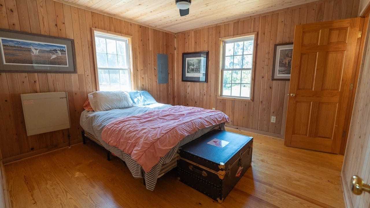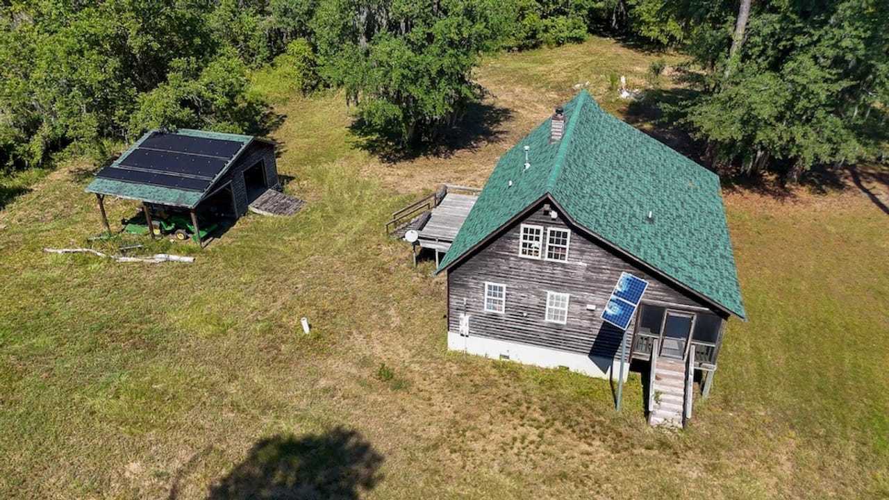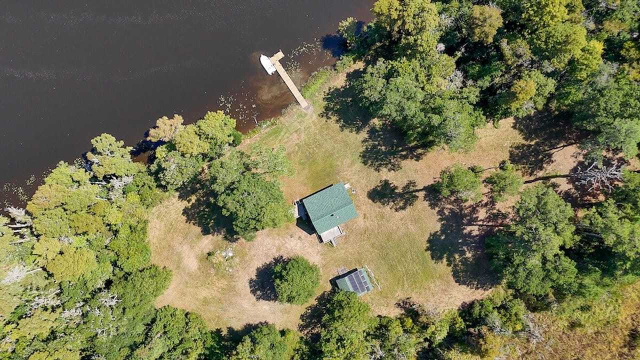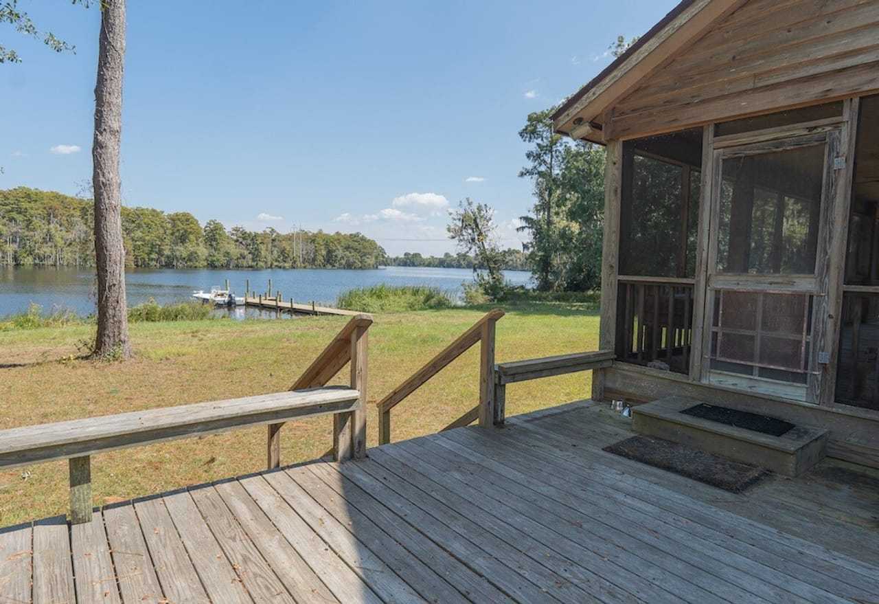 Improvements include a thoughtfully placed residence built in 1998, situated to capture prevailing breezes and designed with a screened porch overlooking the Neuse River and private dock. The interior offers an open layout with rare white juniper finishes, multiple bedrooms, and modern amenities, while a 5 kW solar array, updated lithium batteries, inverter, and a permitted well provide reliable off-grid living. Additional structures include a large shed for equipment and tractor storage, supporting the property’s recreational and practical uses.