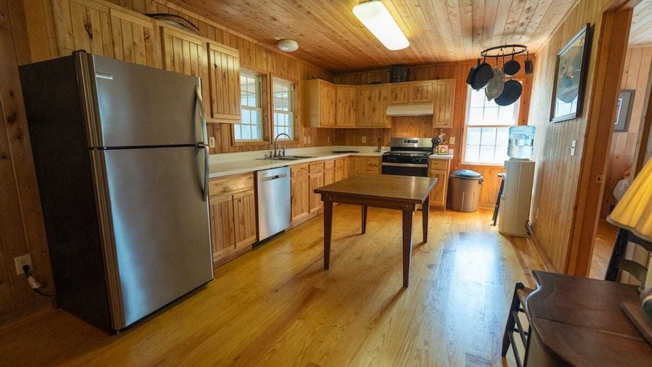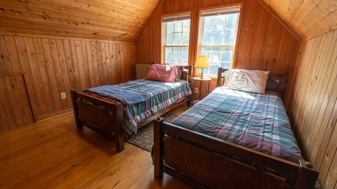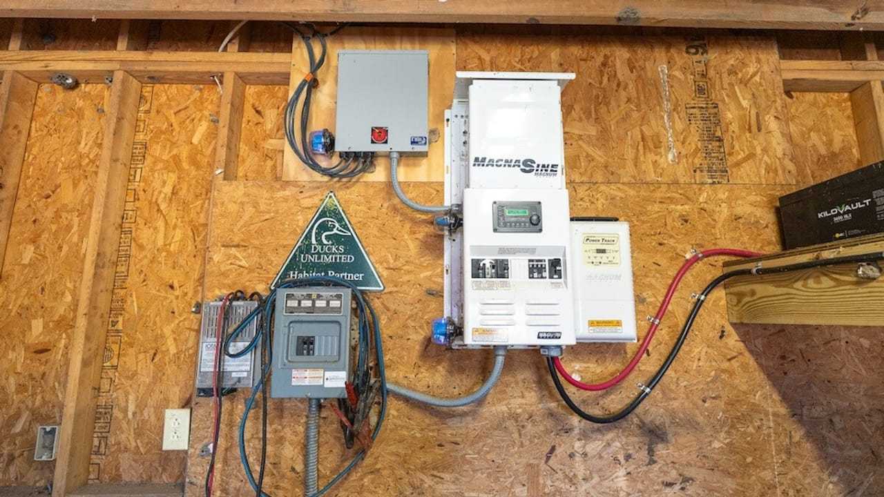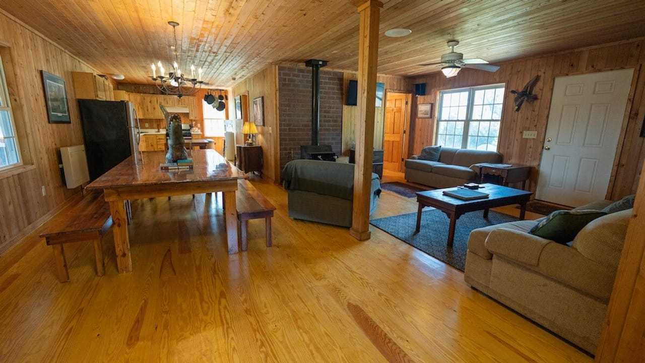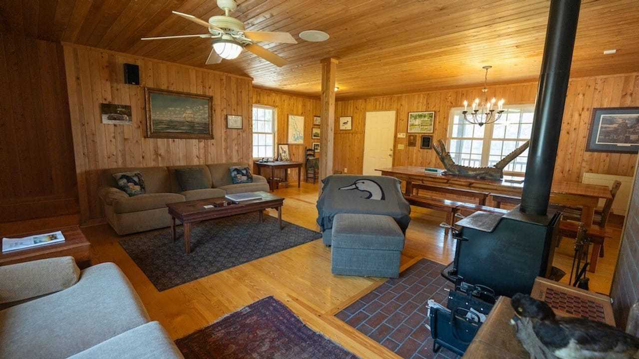Improvements include a thoughtfully placed residence built in 1998, situated to capture prevailing breezes and designed with a screened porch overlooking the Neuse River and private dock. The interior offers an open layout with rare white juniper finishes, multiple bedrooms, and modern amenities, while a 5 kW solar array, updated lithium batteries, inverter, and a permitted well provide reliable off-grid living. Additional structures include a large shed for equipment and tractor storage, supporting the property’s recreational and practical uses.