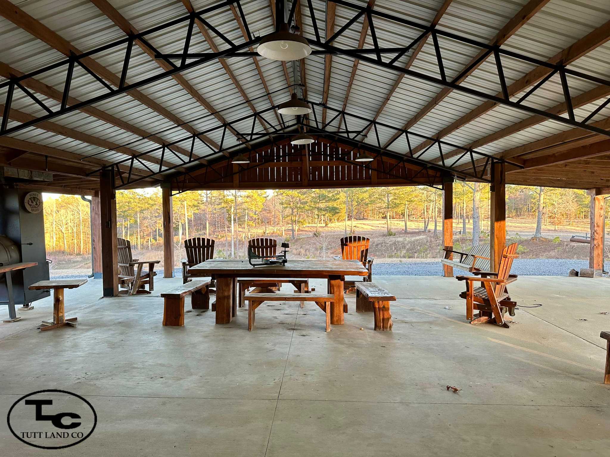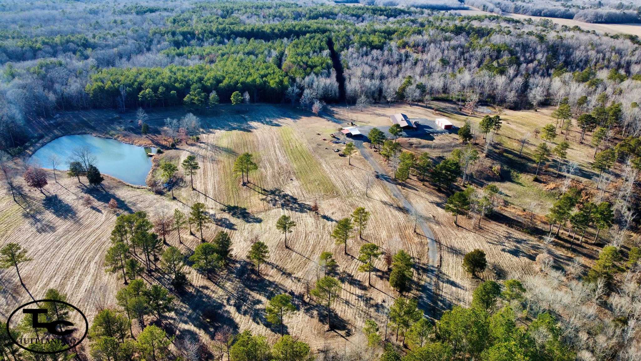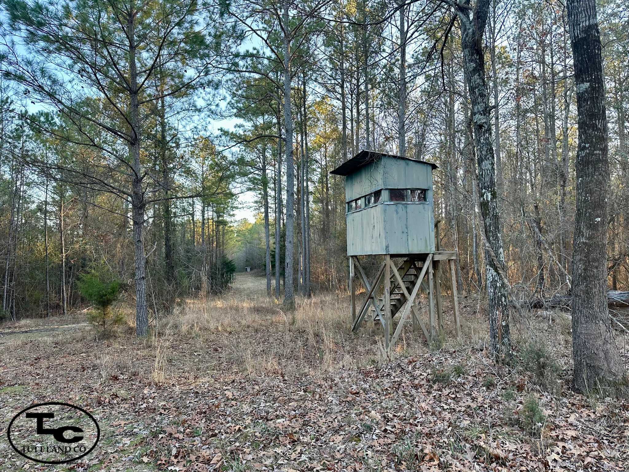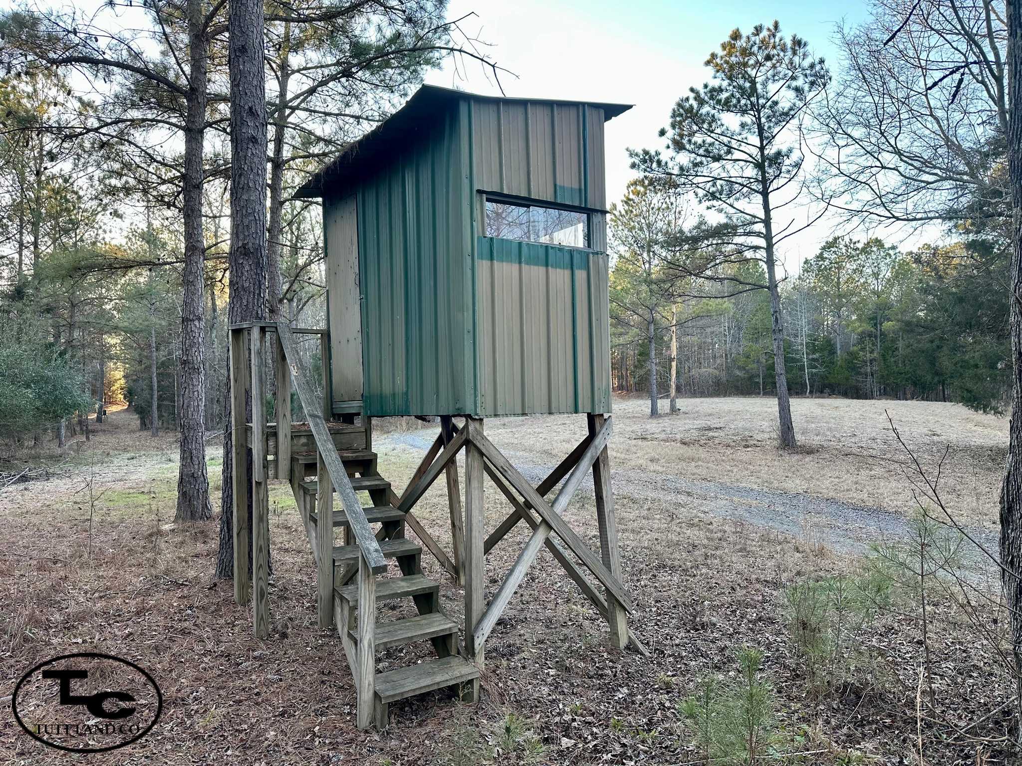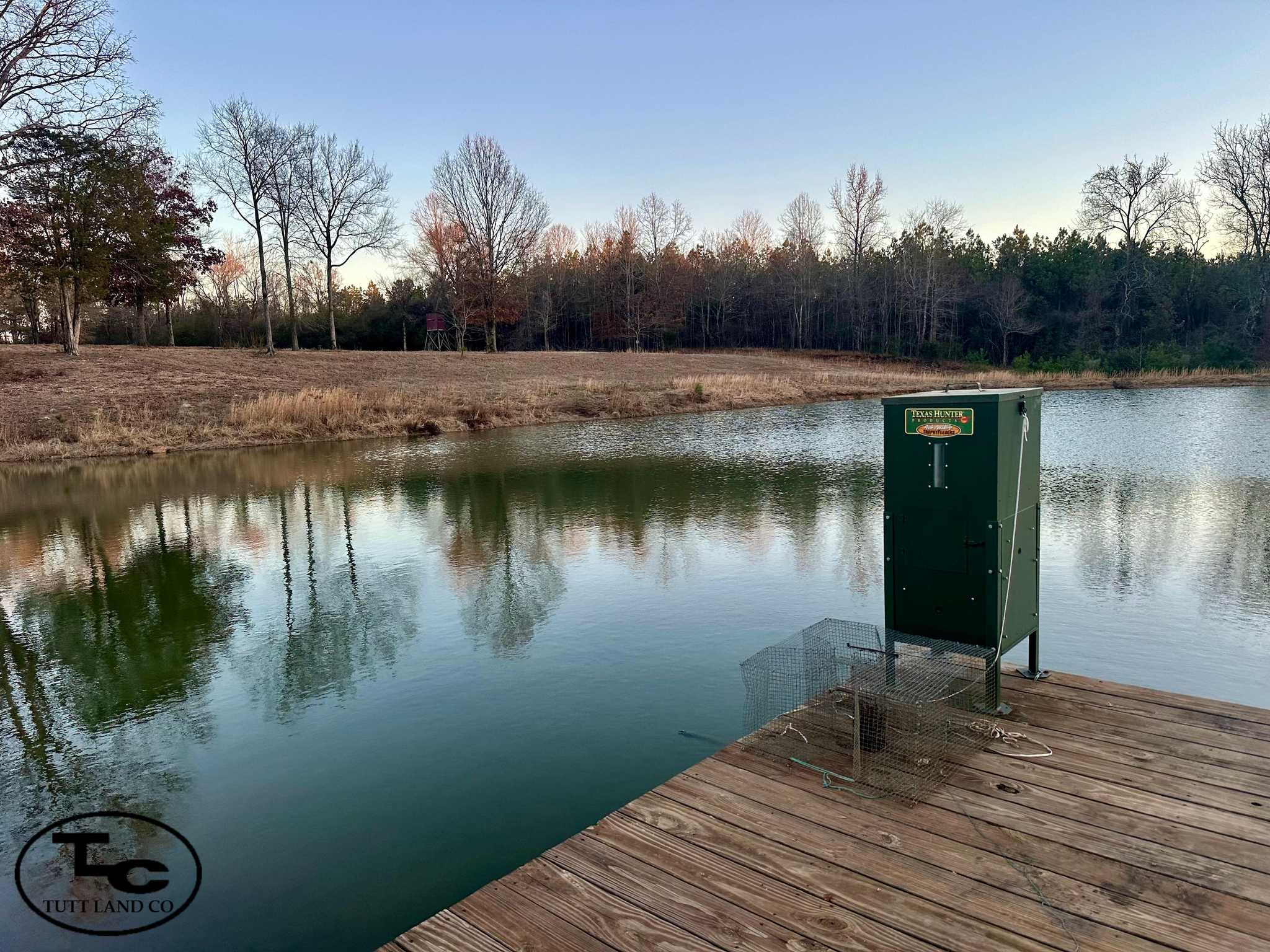 Around the camp, you will find several equipment sheds for easy, safe, and dry storage of tractors, buggies, etc. Below the hill, you will find a beautiful 1ac stocked lake for fishing. There is a nice pier over the water with a fish feeder. Even though the fishing is great, this property was designed with hunting in mind. There is a dry internal road system navigating throughout the property that connects to an adjoining 452ac hunting lease. Each foodplot is strategically laid out and has large shooting houses. Deer hunting and turkey hunting are the highlights. This area can consistently produce 140-160" mature bucks and mornings full of multiple gobbling turkeys. And the pressure is relatively lower given the large adjoining landowners. The property has a nice mix of merchantable hardwoods and pines giving it great diversity for wildlife and timber investment.