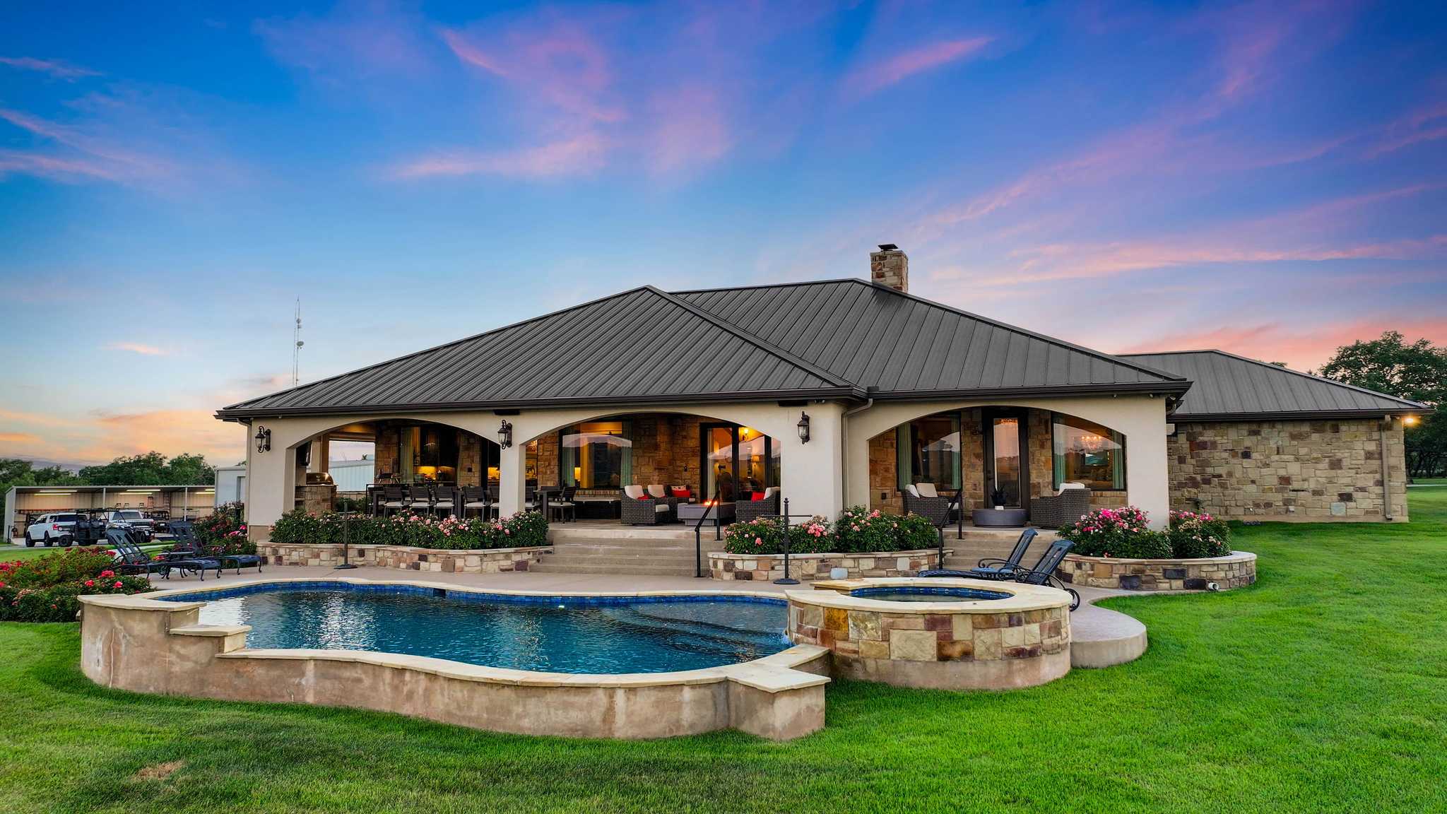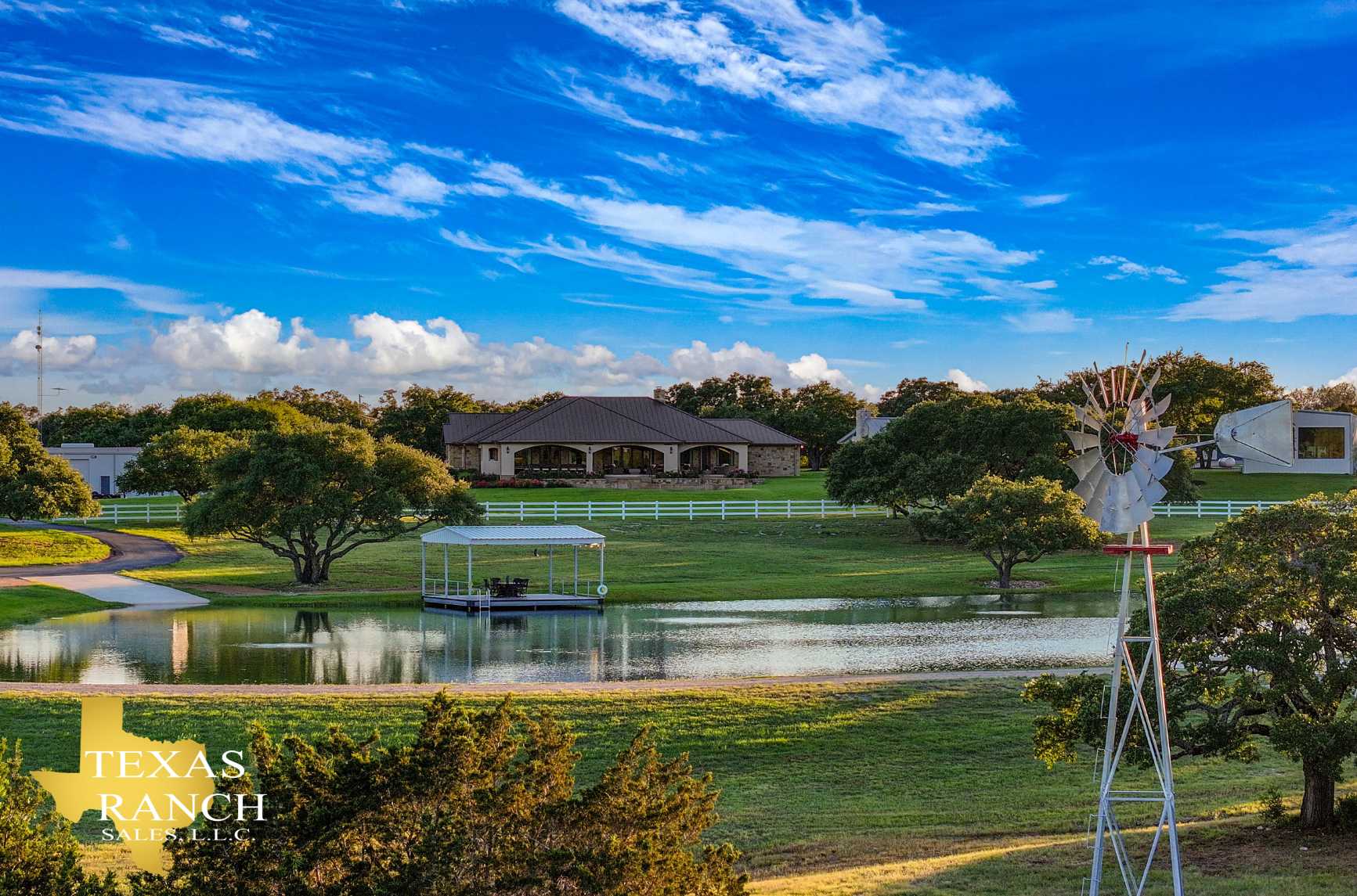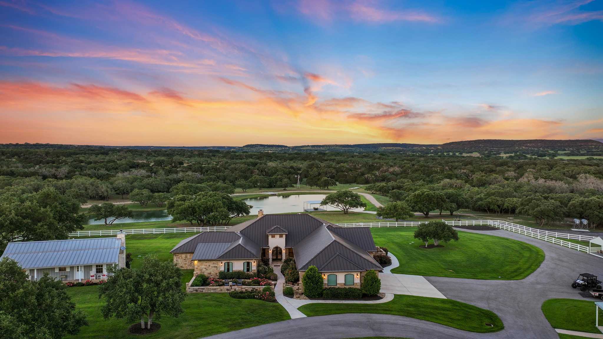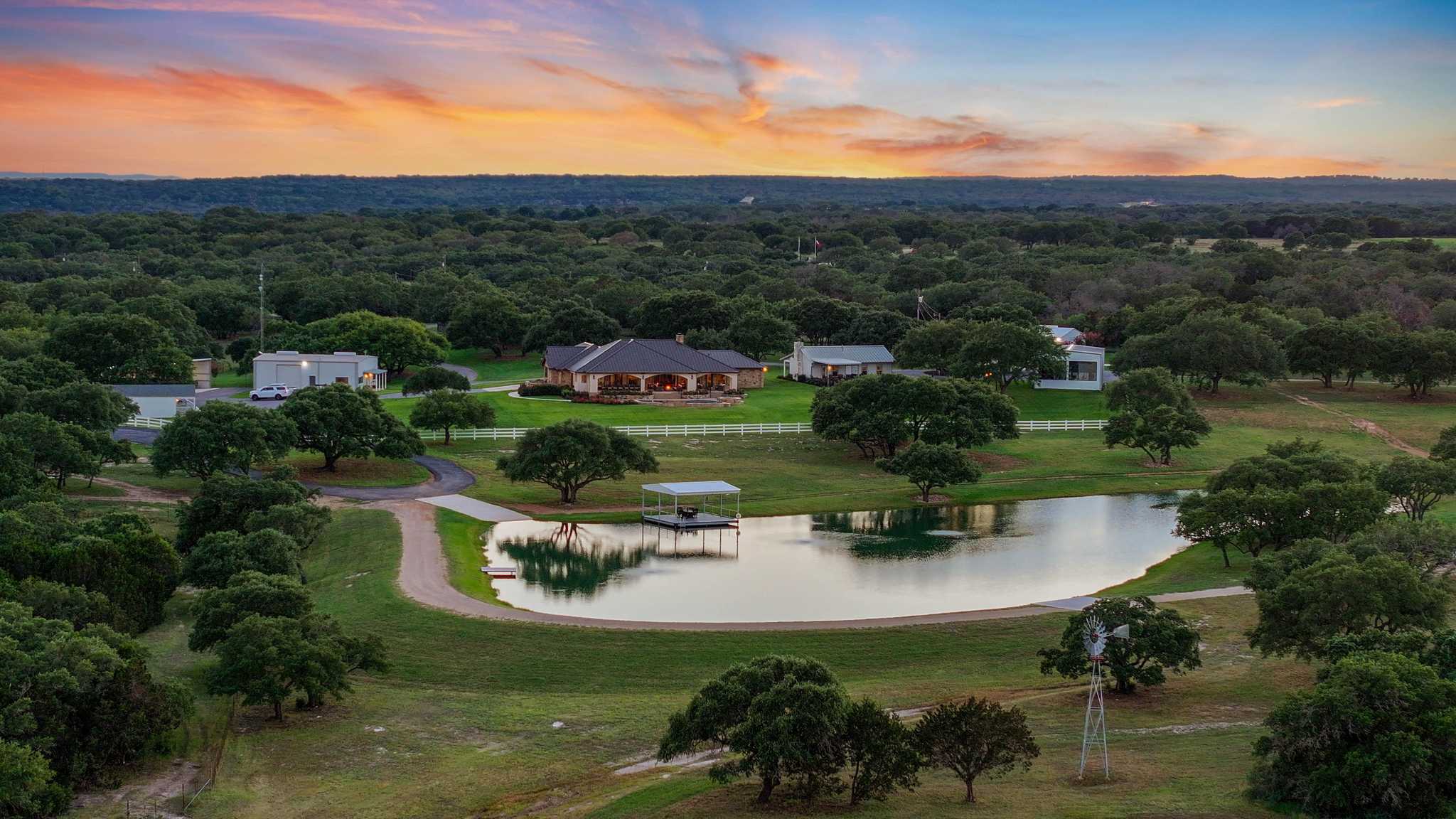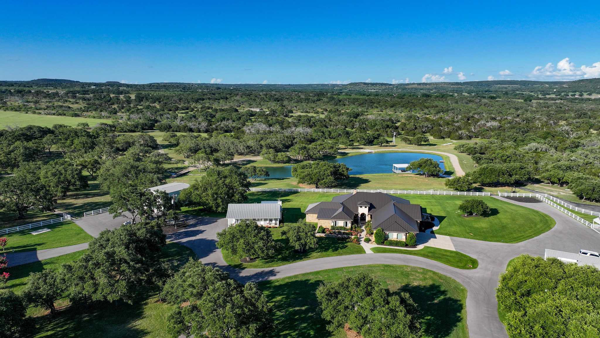 This ranch with its top-notch improvements highlighting impressive attention to detail, is a dream property for anyone who loves to entertain. It features a stunning 3BR/3.5BA luxury custom home overlooking meticulously groomed and landscaped grounds cascading down and surrounding a gorgeous lake. The house offers an architectural masterpiece of spacious & open living and dining areas with marble floors, granite countertops, large picture windows, and a floor-to-ceiling rock fireplace. The master suite includes a large, elegant bathroom and a significant walk-in closet. The back porch has automatic patio shades on all sides and includes an outdoor kitchen and spacious and comfortable seating areas throughout, all overlooking the pool, fire pit, hot tub, lake, and distant rolling terrain.