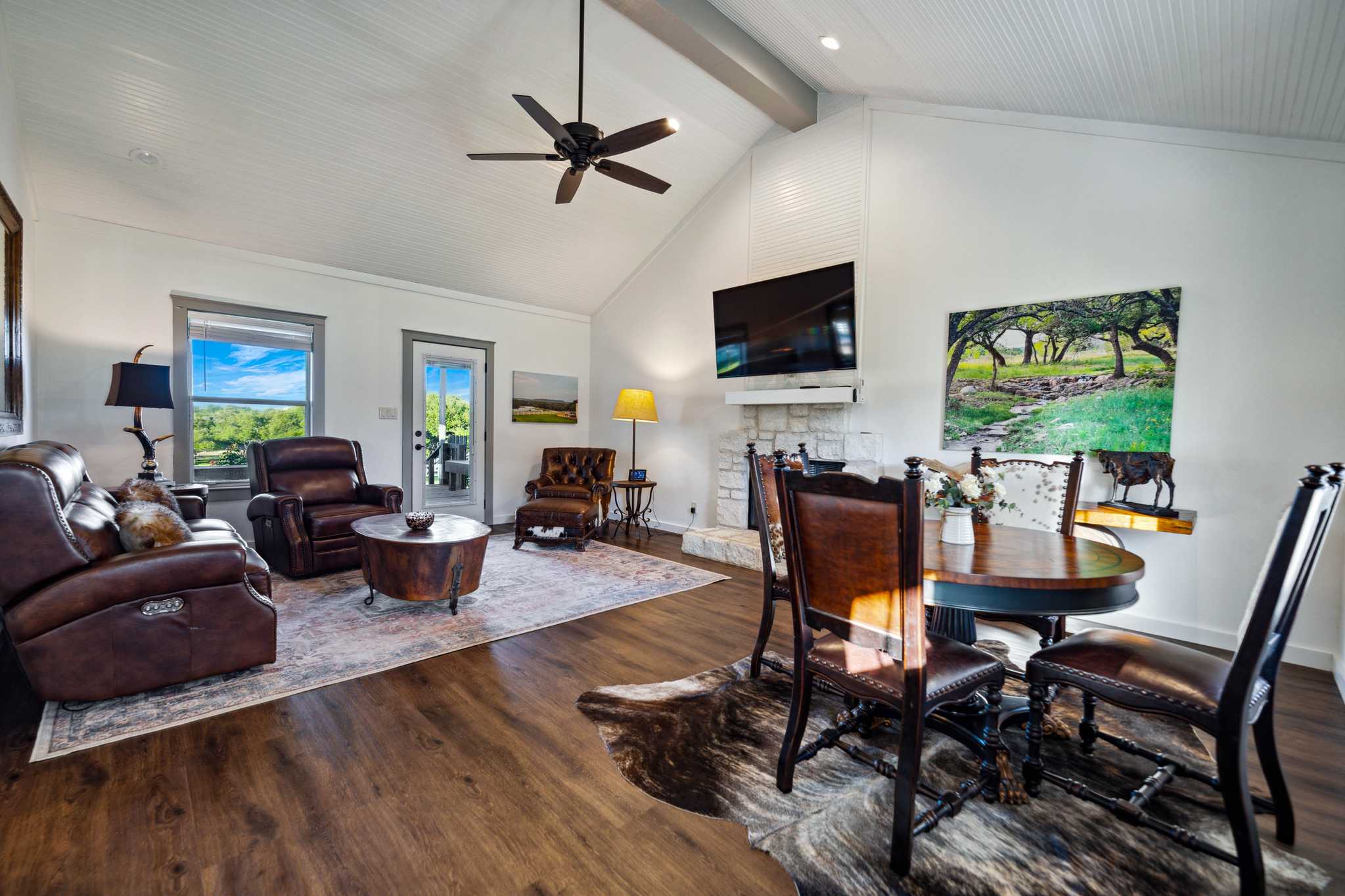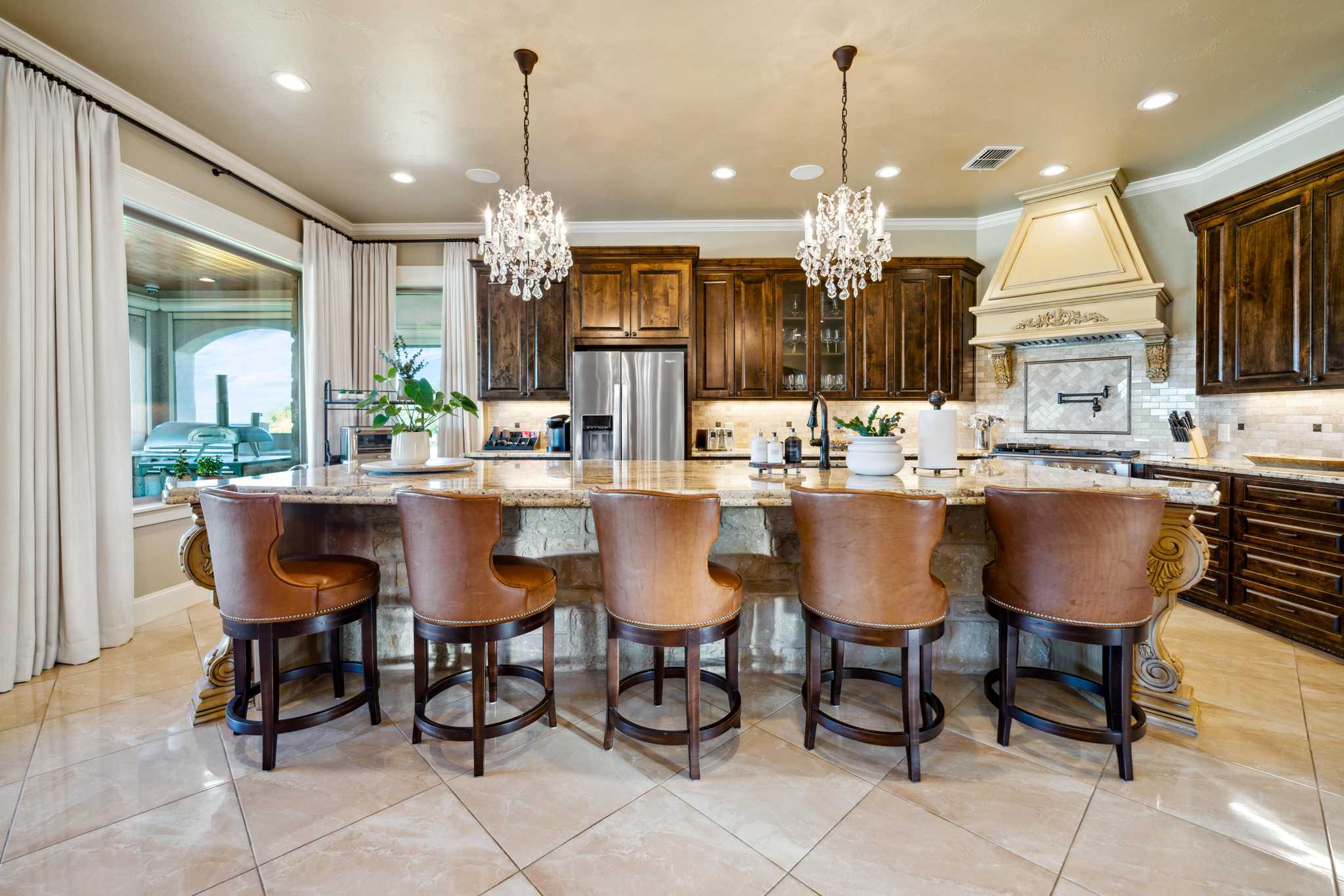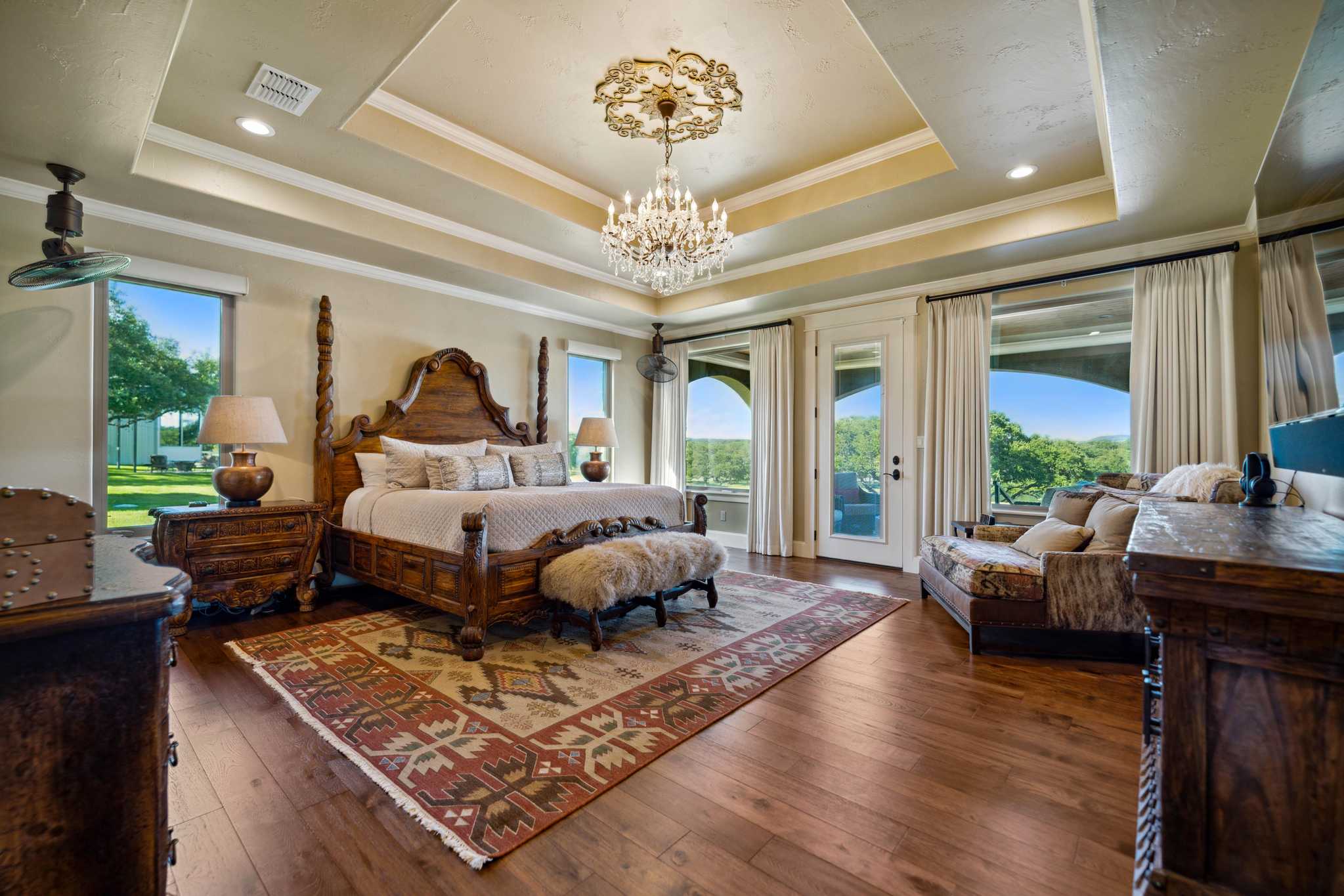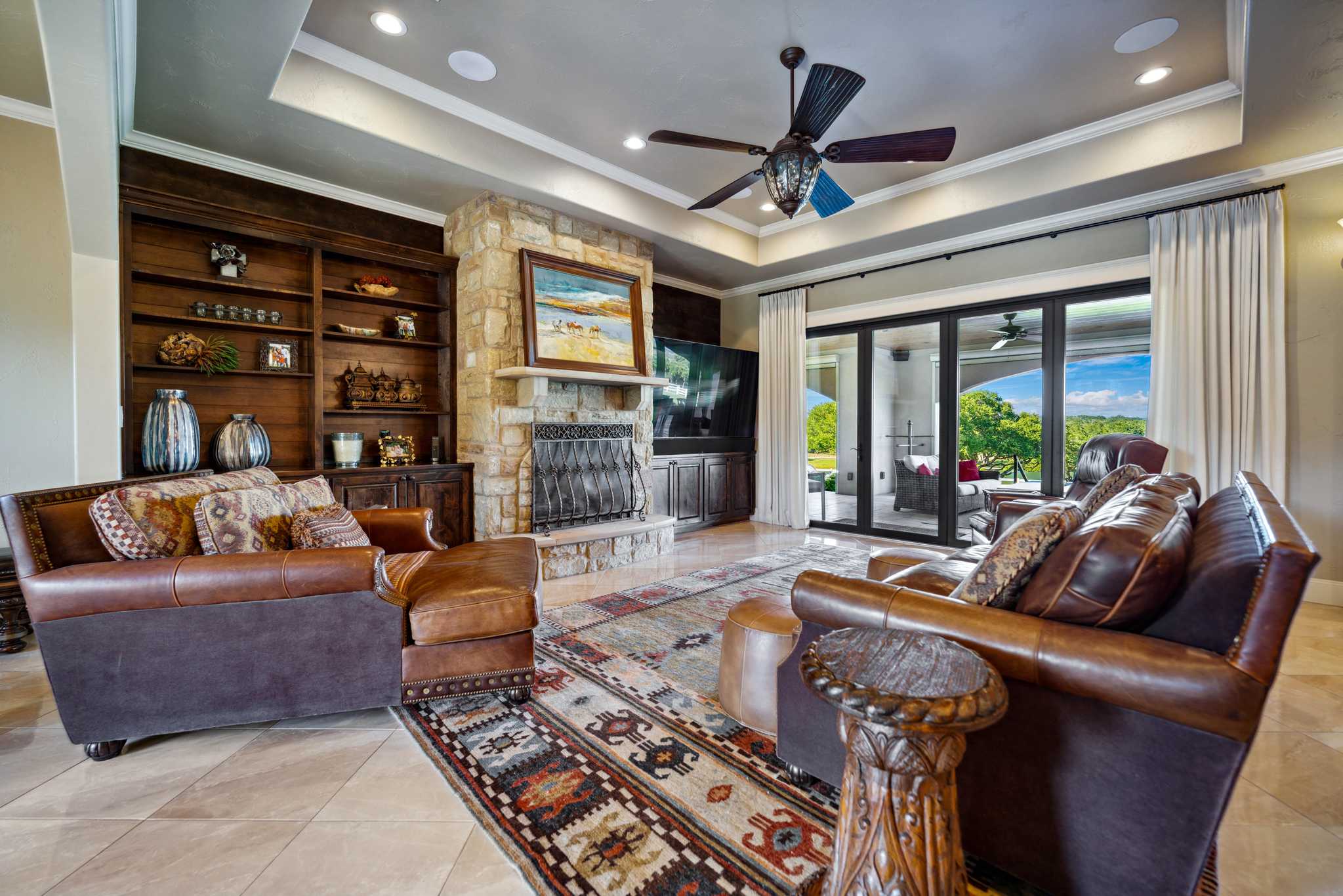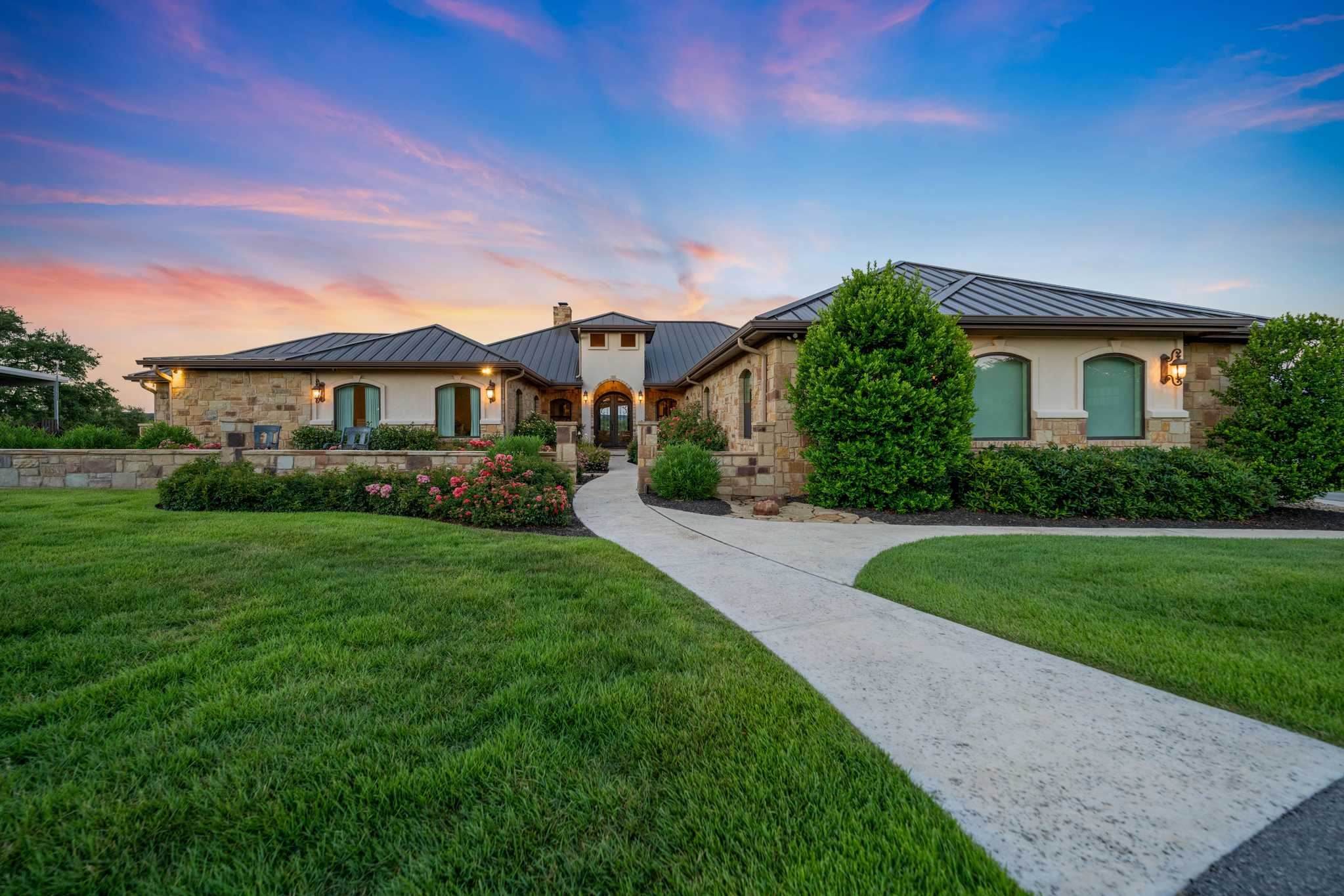 This ranch with its top-notch improvements highlighting impressive attention to detail, is a dream property for anyone who loves to entertain. It features a stunning 3BR/3.5BA luxury custom home overlooking meticulously groomed and landscaped grounds cascading down and surrounding a gorgeous lake. The house offers an architectural masterpiece of spacious & open living and dining areas with marble floors, granite countertops, large picture windows, and a floor-to-ceiling rock fireplace. The master suite includes a large, elegant bathroom and a significant walk-in closet. The back porch has automatic patio shades on all sides and includes an outdoor kitchen and spacious and comfortable seating areas throughout, all overlooking the pool, fire pit, hot tub, lake, and distant rolling terrain.