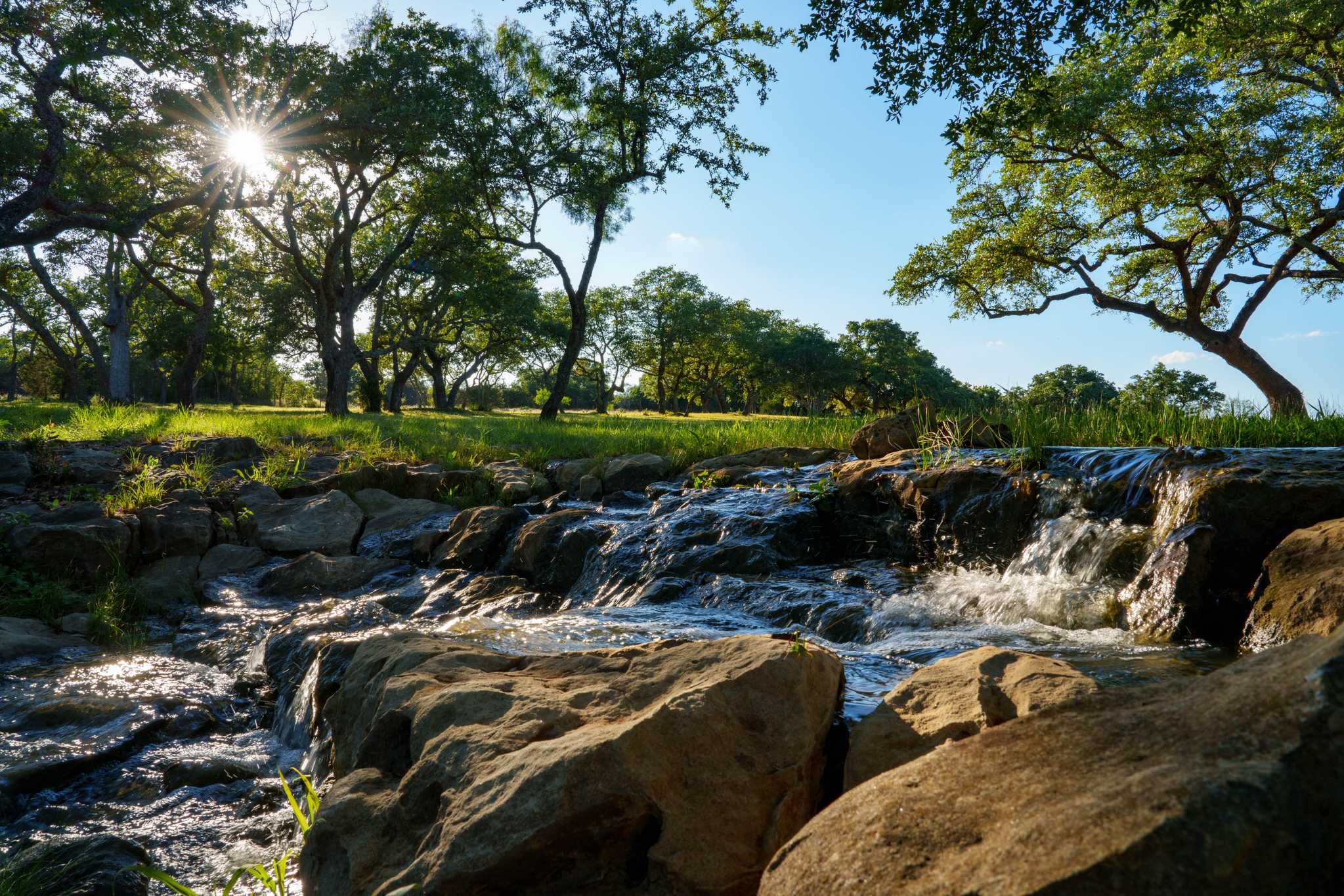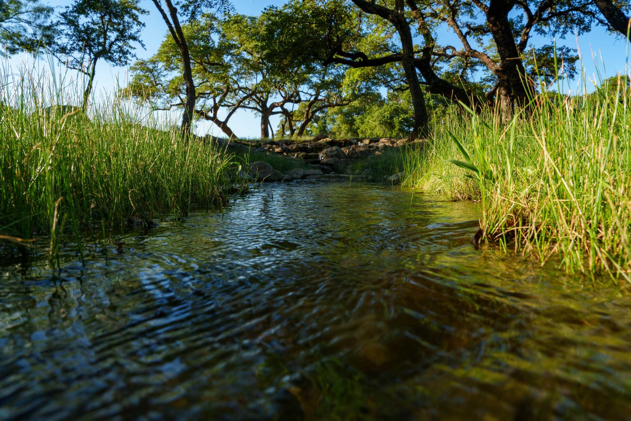 The ranch features a multipurpose 1.5 acre lake directly behind the main home, complete with two small piers, a covered dock, a swing, and a stunning backdrop of a windmill. There is also 650 ft of constant re-circulating creek with two bridges, fed by a well. The property has two high capacity, crystal clear water wells. There are also eleven water storage tanks with a capacity of 27,500+ gallons, commercial filtration, and a water softener system.