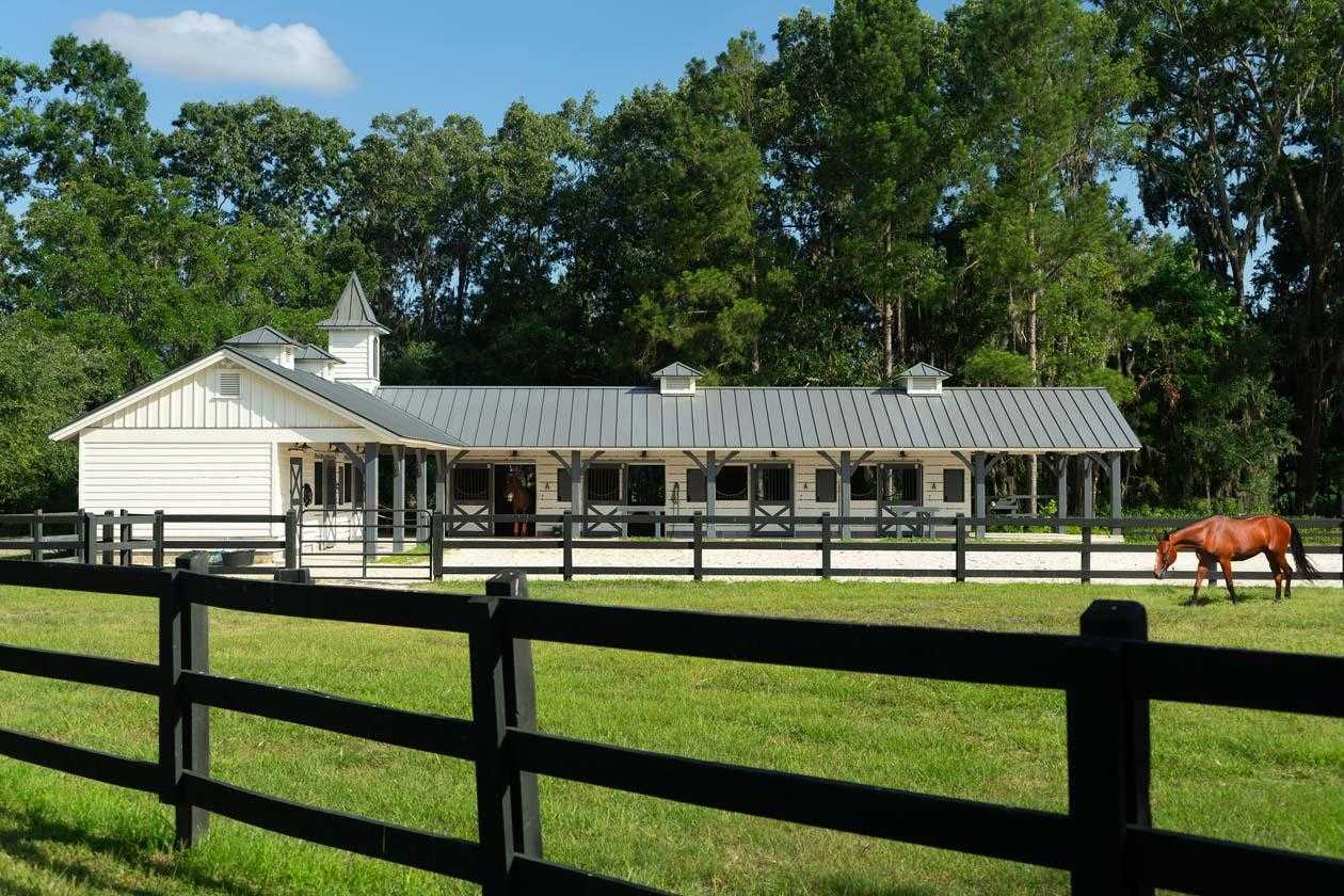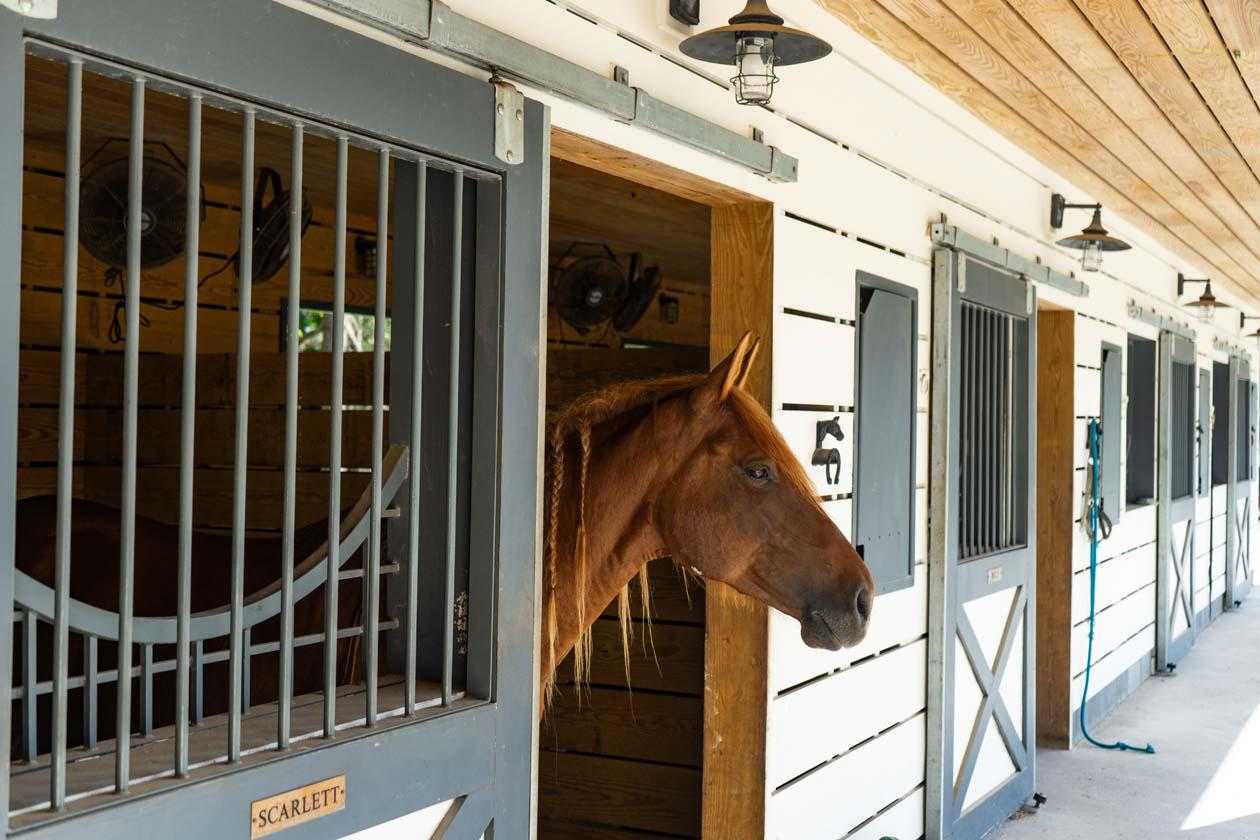 A custom built horse barn has six oversized stalls, a tack room with bathroom, a large wash bay and a gathering/receiving area. The entire barn is covered by an automatic misting system to control insects. Stalls have high volume fans, multiple windows and high ceilings. Open air gathering/ receiving area.