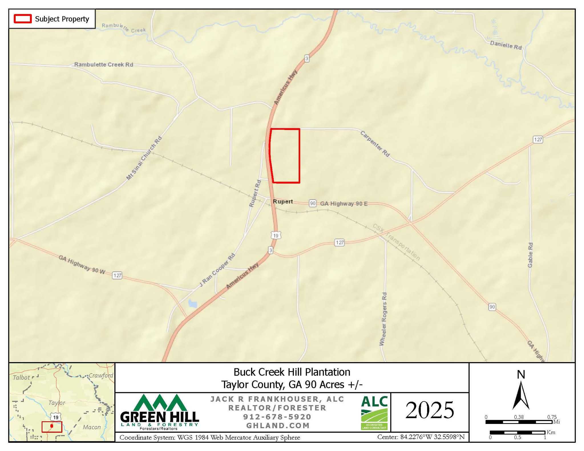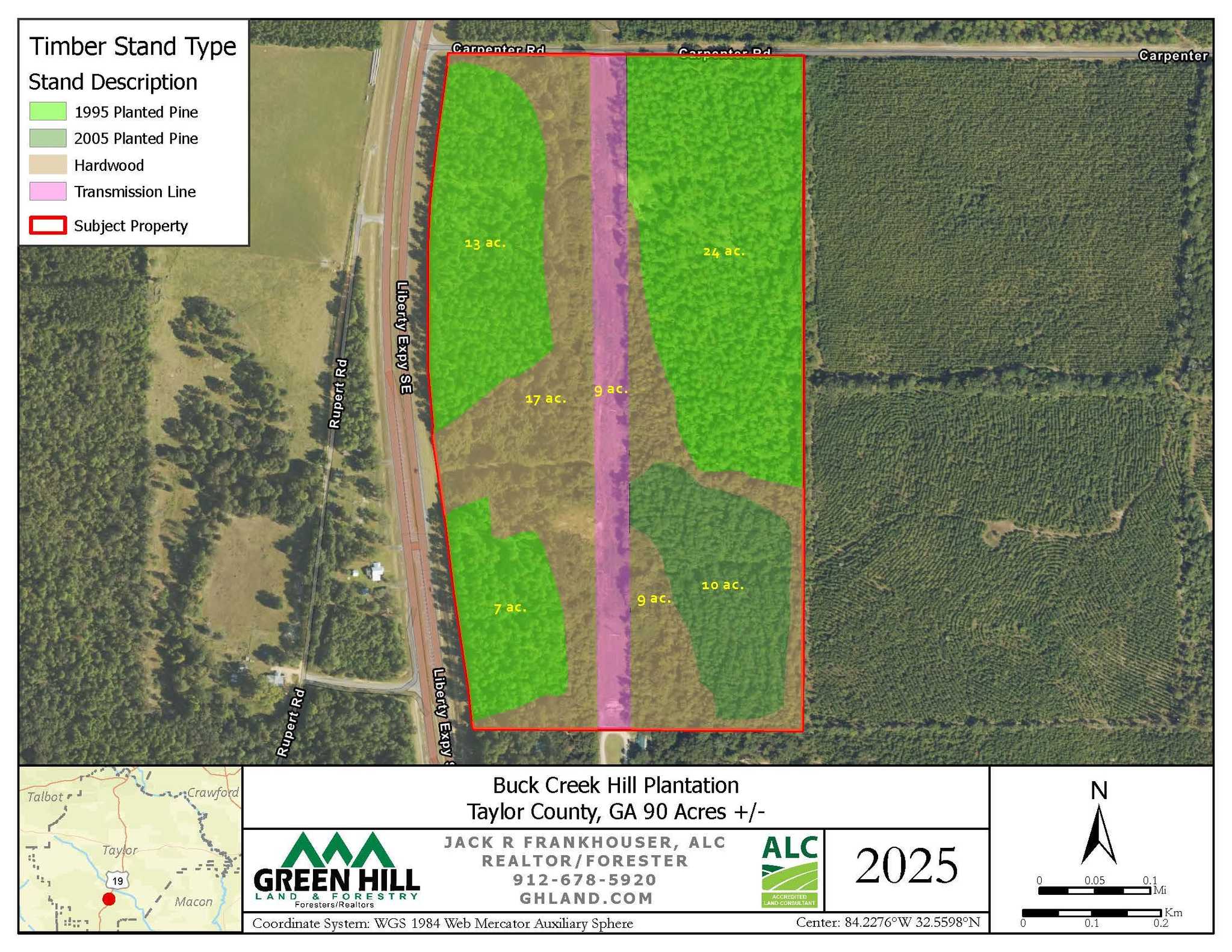 Located in an area well known for producing large deer, Buck Creek Hill Plantation has the perfect location and layout for your next hunting property. Just south of Butler in Taylor County, the 90-acre property is a blend of mature pine plantations, upland oaks, and seasonal creeks. The 30-year-old mature pine plantations have been manicured to produce consistent growth and quality timber. The pine plantations have the perfect understory with excellent habitat, nutrition and cover.