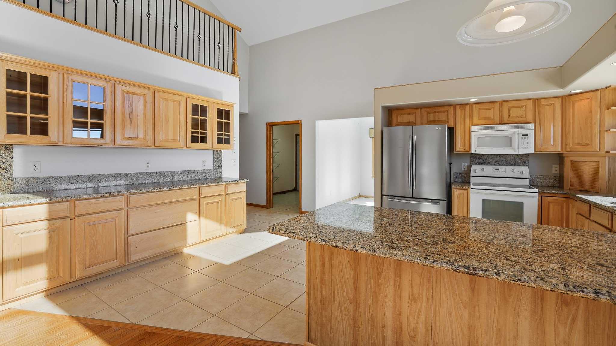 Modern conveniences include two flat-screen televisions and a whole-home sound system with Paradigm ceiling speakers. The main kitchen is equipped with hickory cabinets and granite countertops, while the lower-level kitchen features oak cabinetry. Additional amenities include a water softener and reverse osmosis system. The property is easily accessible via an asphalt driveway that leads from the gate to a turnaround area in front of the home, complete with a small island and a fountain at its center.
