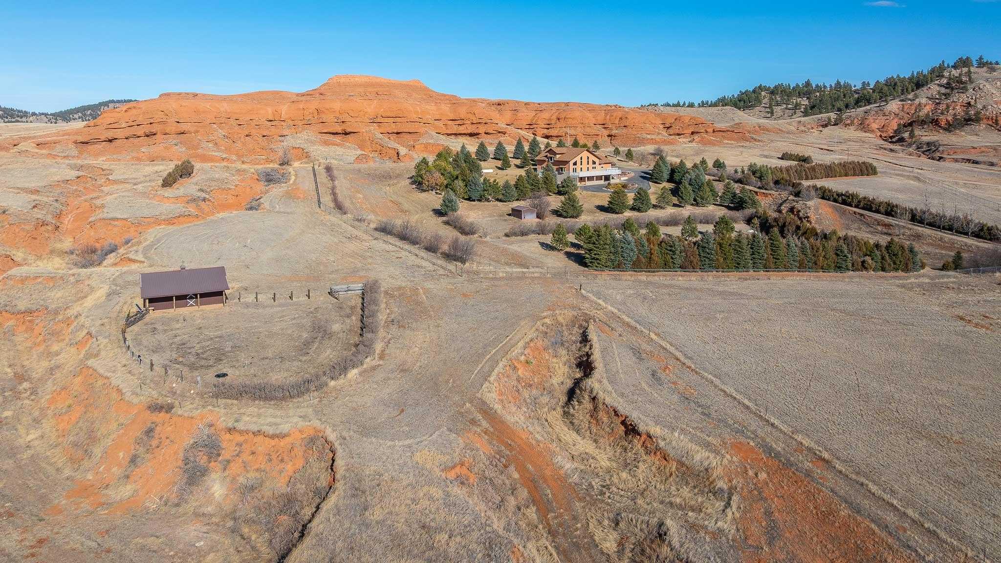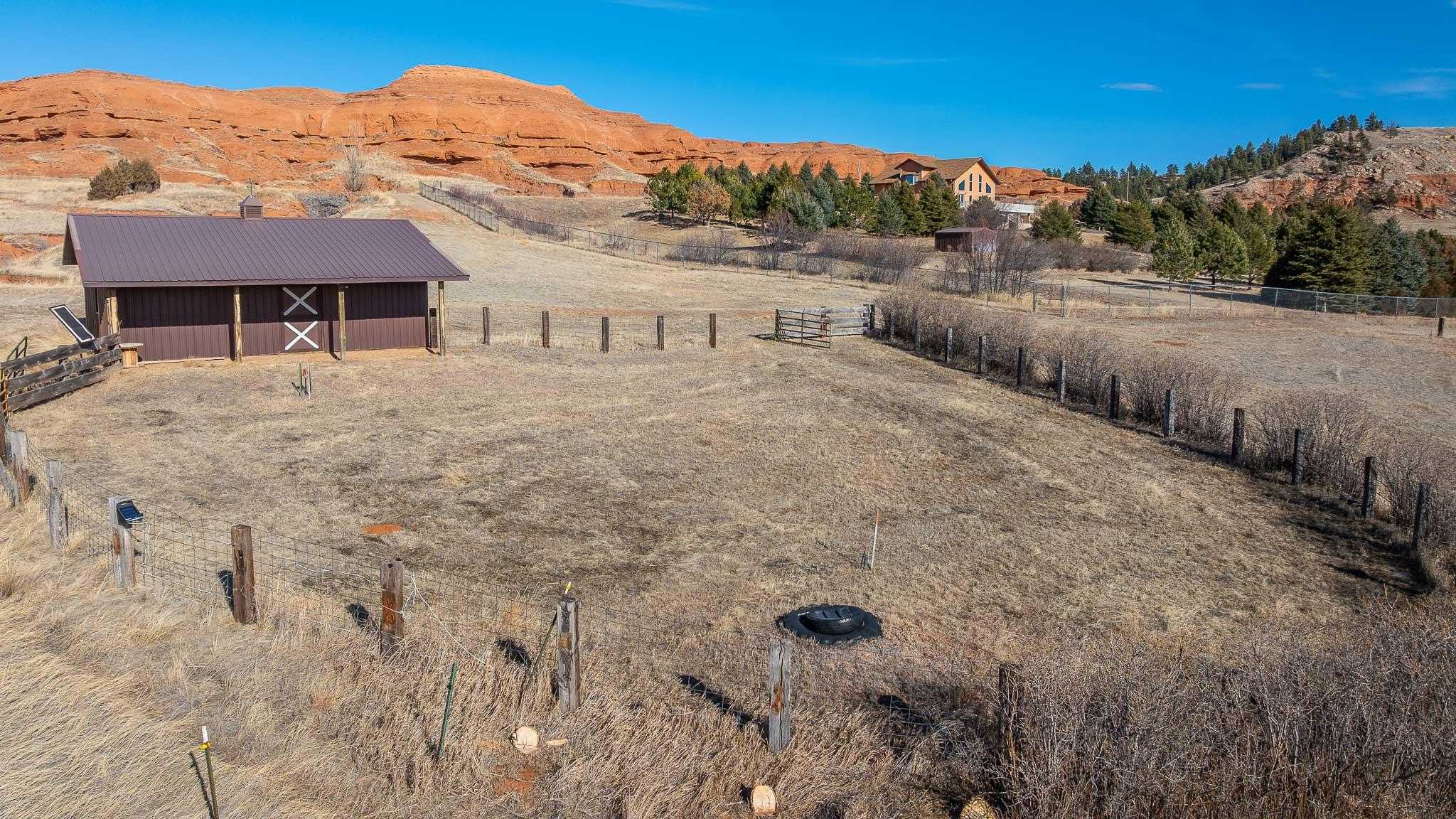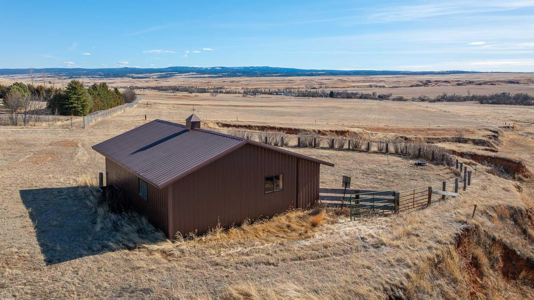 The Oleson Ranchette is a beautifully maintained 59-acre property that seamlessly blends comfort and functionality. Built in 2002, the home is surrounded by a six-foot chain-link fence with an electric automatic drive-through gate, complete with a battery backup for added convenience. Over the years, the owners have thoughtfully planted 1,400 trees, enhancing the propertys privacy and natural beauty. Designed for both equestrian and recreational use, the property includes a well-equipped horse barn with an attached lean-to and tack room, as well as a small shed for additional storage. The breathtaking views of Crow Peak to the southeast and the Bear Lodge Mountains to the west add to the propertys scenic appeal. With its ample space and versatile layout, the home is ideal as a private retreat or hunting lodge. A durable three-rail sucker rod fence lines the county road, contributing to both the propertys charm and security.