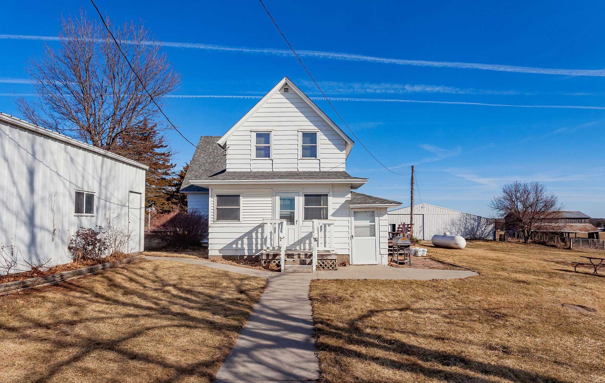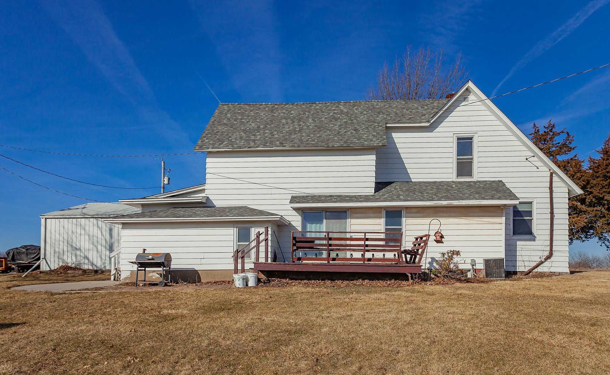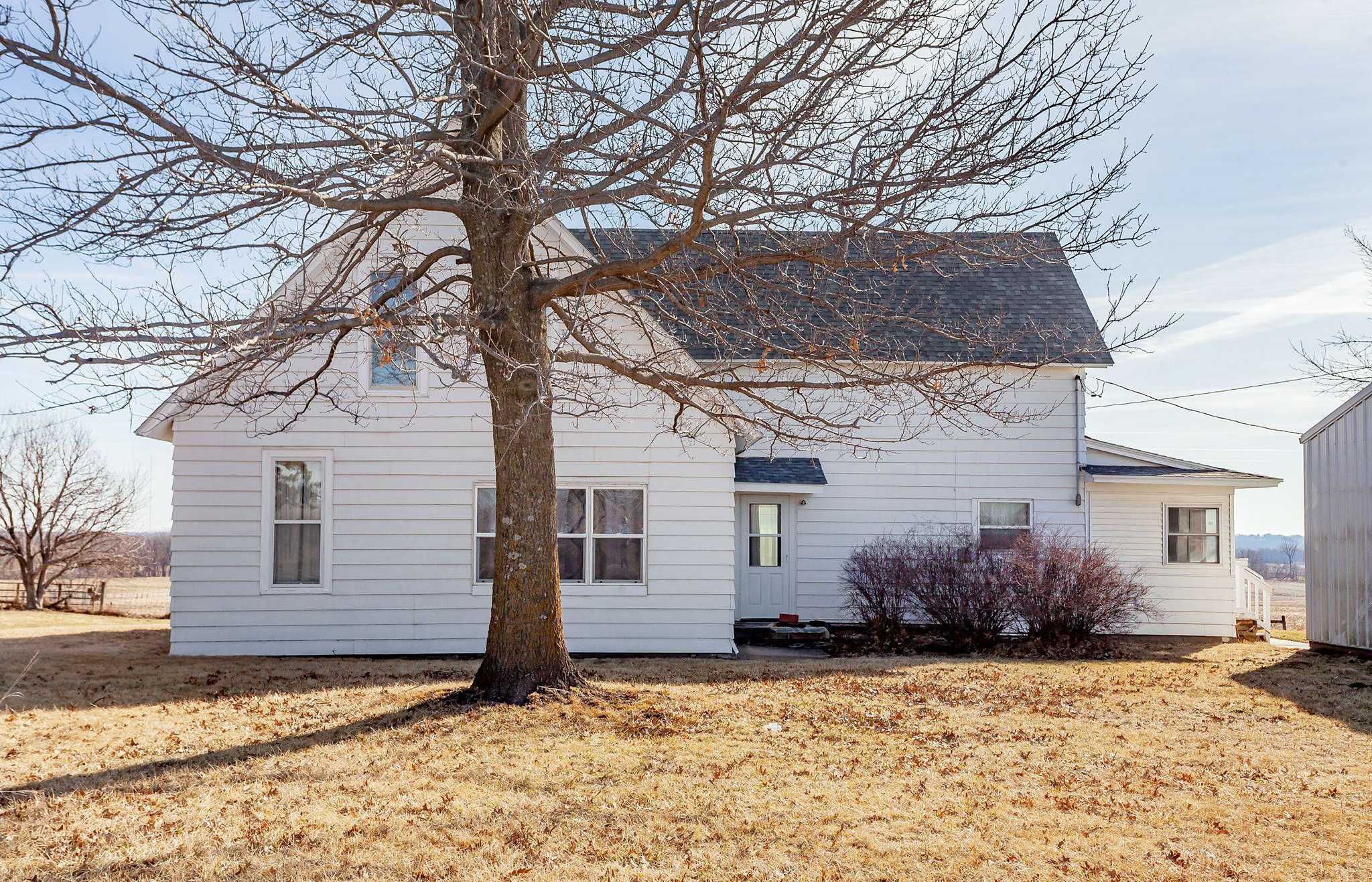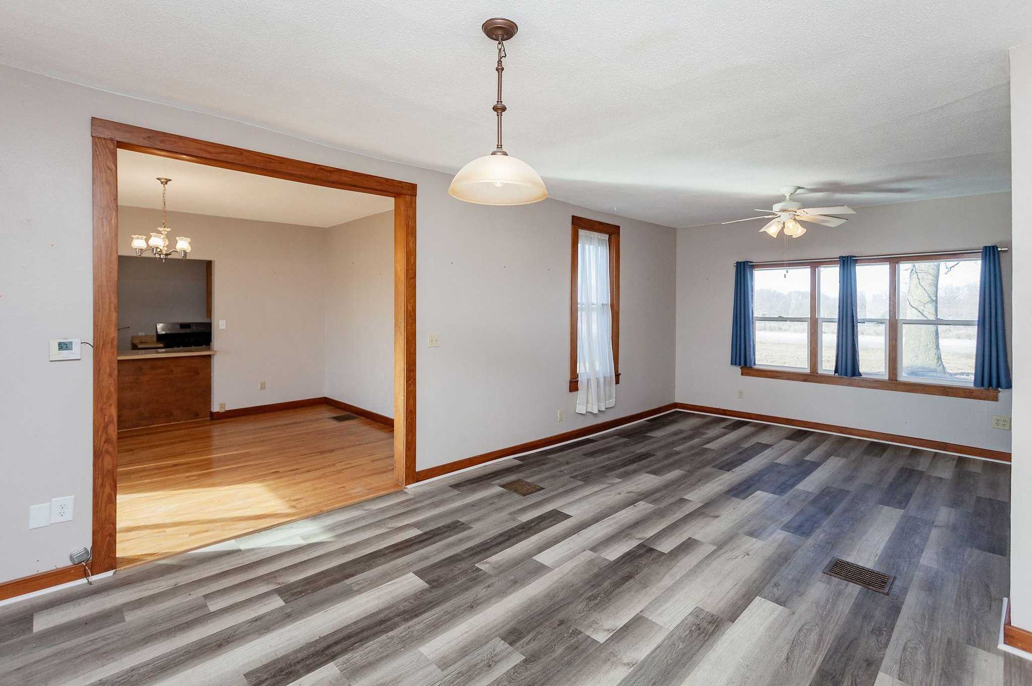 The farmhouse is an early-1900s, 1 1/2-story home with 1,523 square feet of finished living space, featuring 3 bedrooms, 1 bathroom, central air, and heat. The main level is an open concept, with a spacious living room and kitchen. The home has been well maintained with various improvements over the years, including a newer roof, newer flooring, and more. Additionally, there is an oversized 26' x 30' detached two-car garage, along with two farm buildings: a 44' x 60' steel shed with concrete floors and a red, rustic 1950s pole barn.