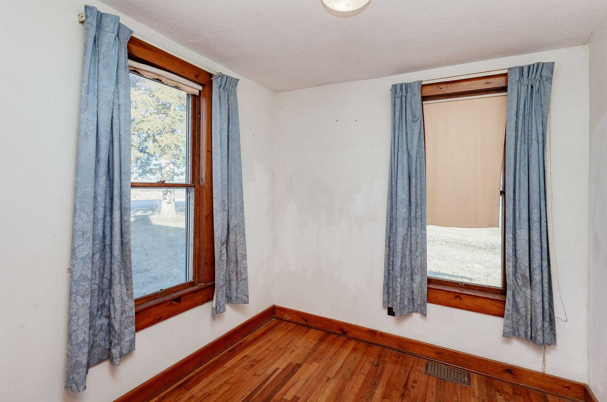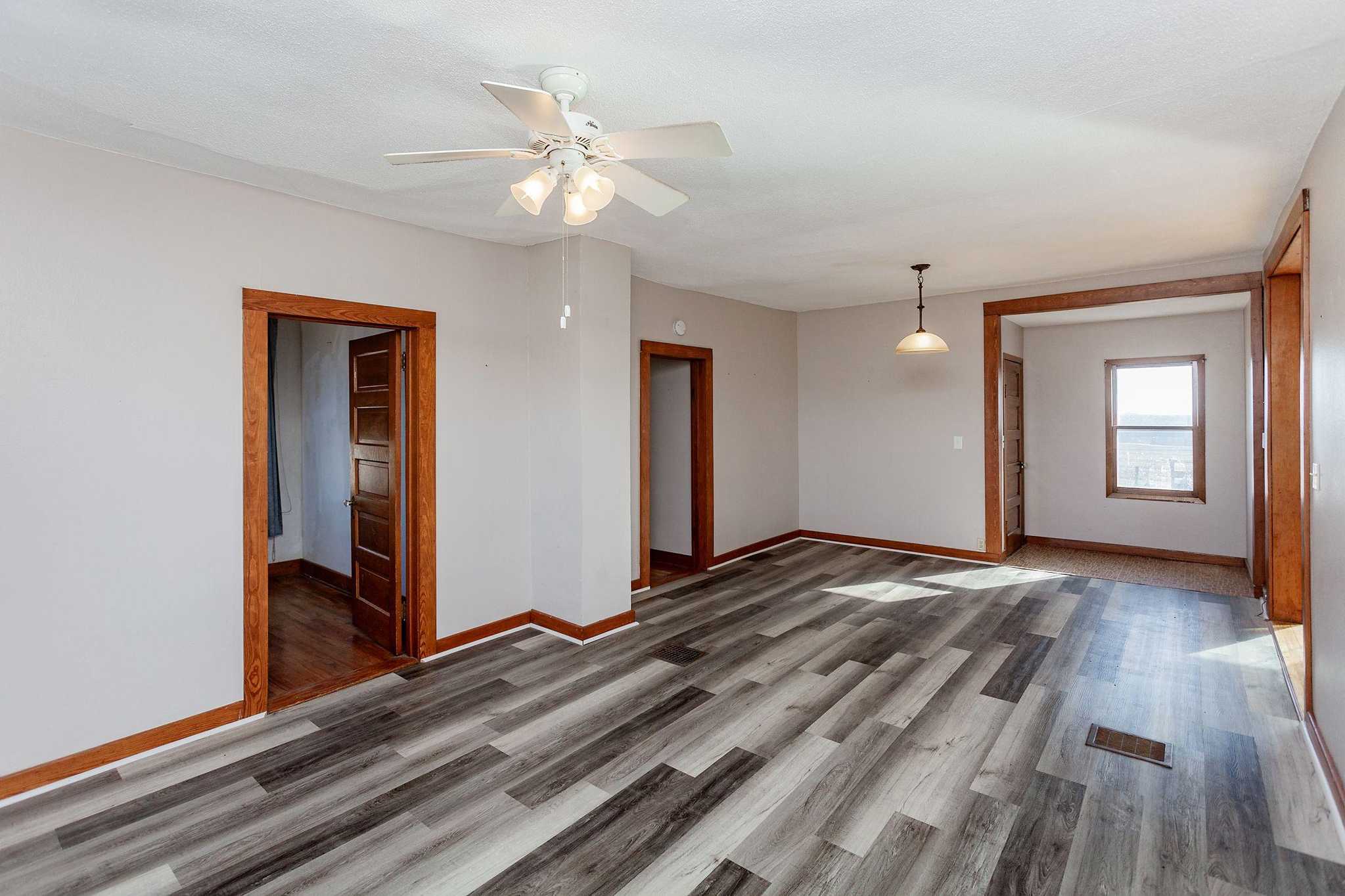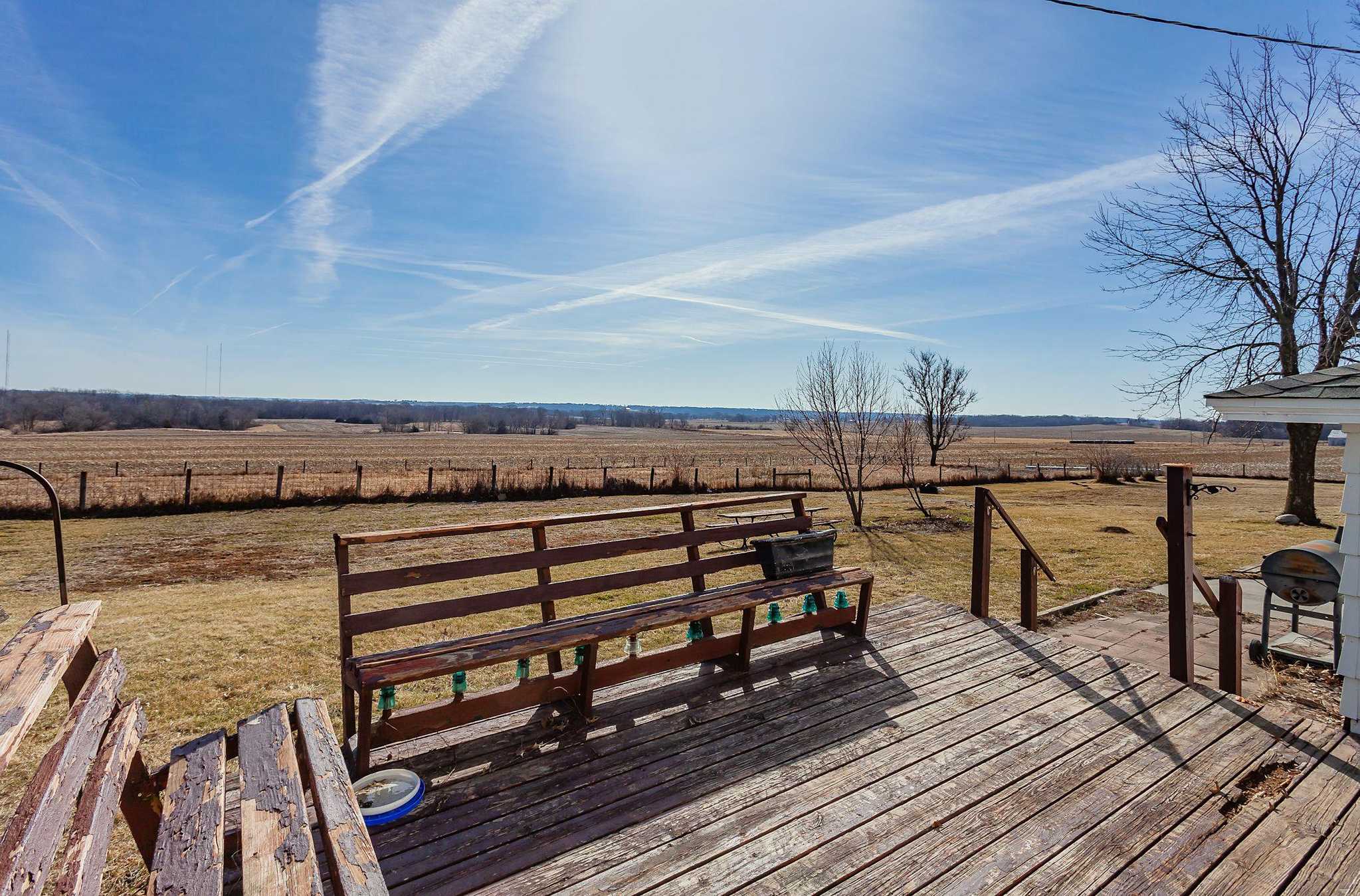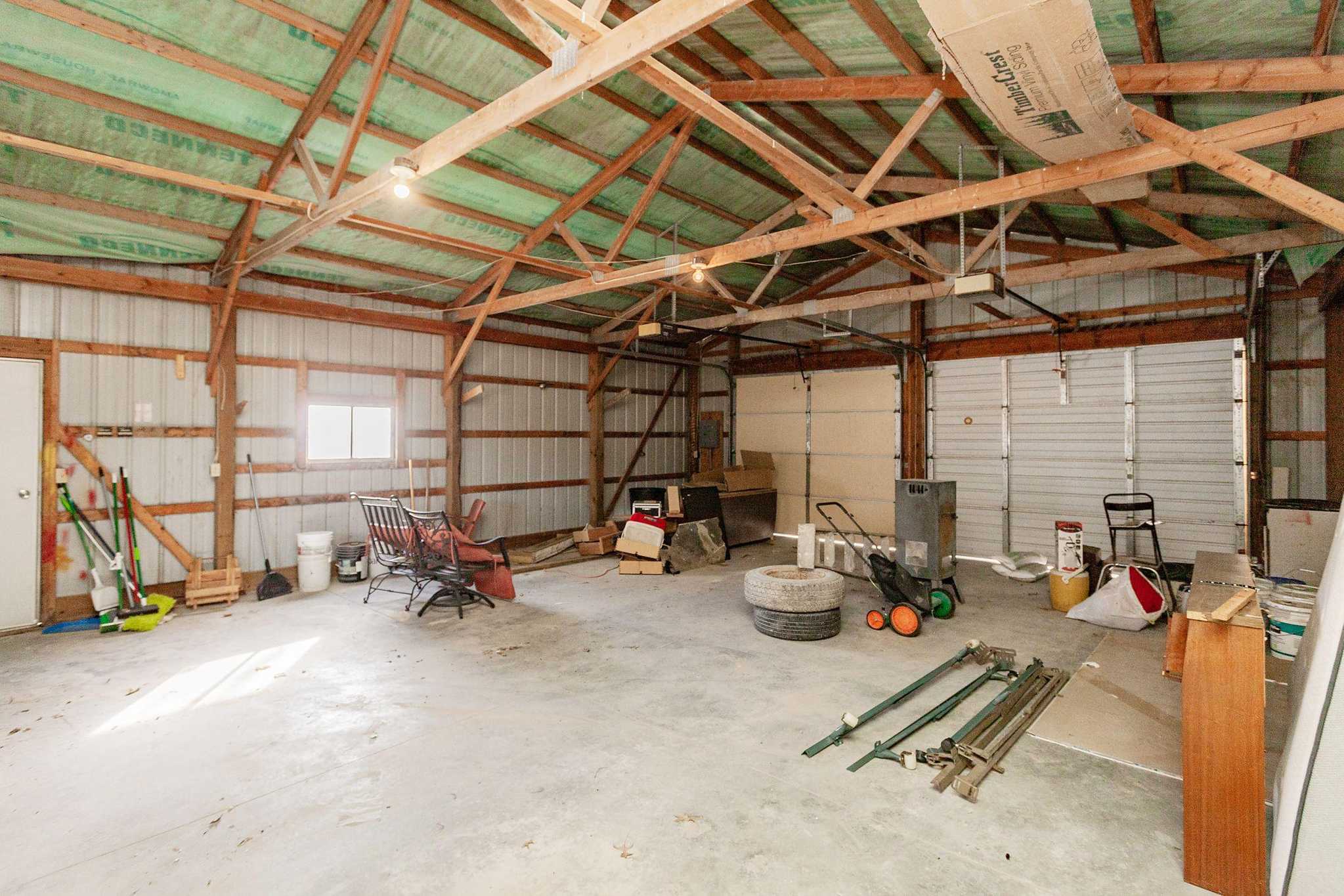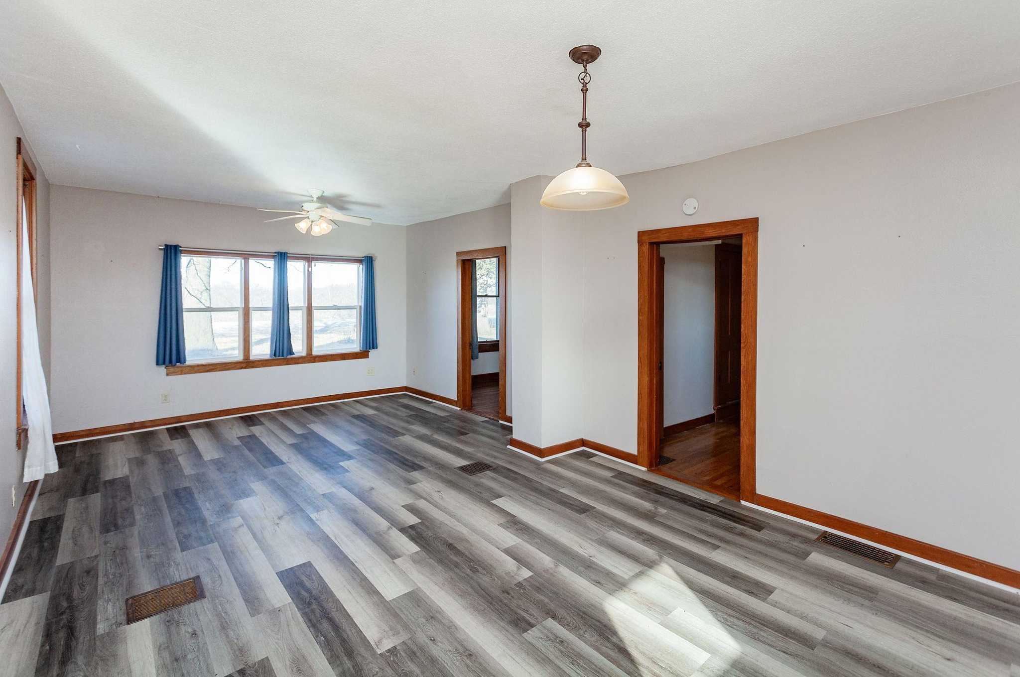 The farmhouse is an early-1900s, 1 1/2-story home with 1,523 square feet of finished living space, featuring 3 bedrooms, 1 bathroom, central air, and heat. The main level is an open concept, with a spacious living room and kitchen. The home has been well maintained with various improvements over the years, including a newer roof, newer flooring, and more. Additionally, there is an oversized 26' x 30' detached two-car garage, along with two farm buildings: a 44' x 60' steel shed with concrete floors and a red, rustic 1950s pole barn.