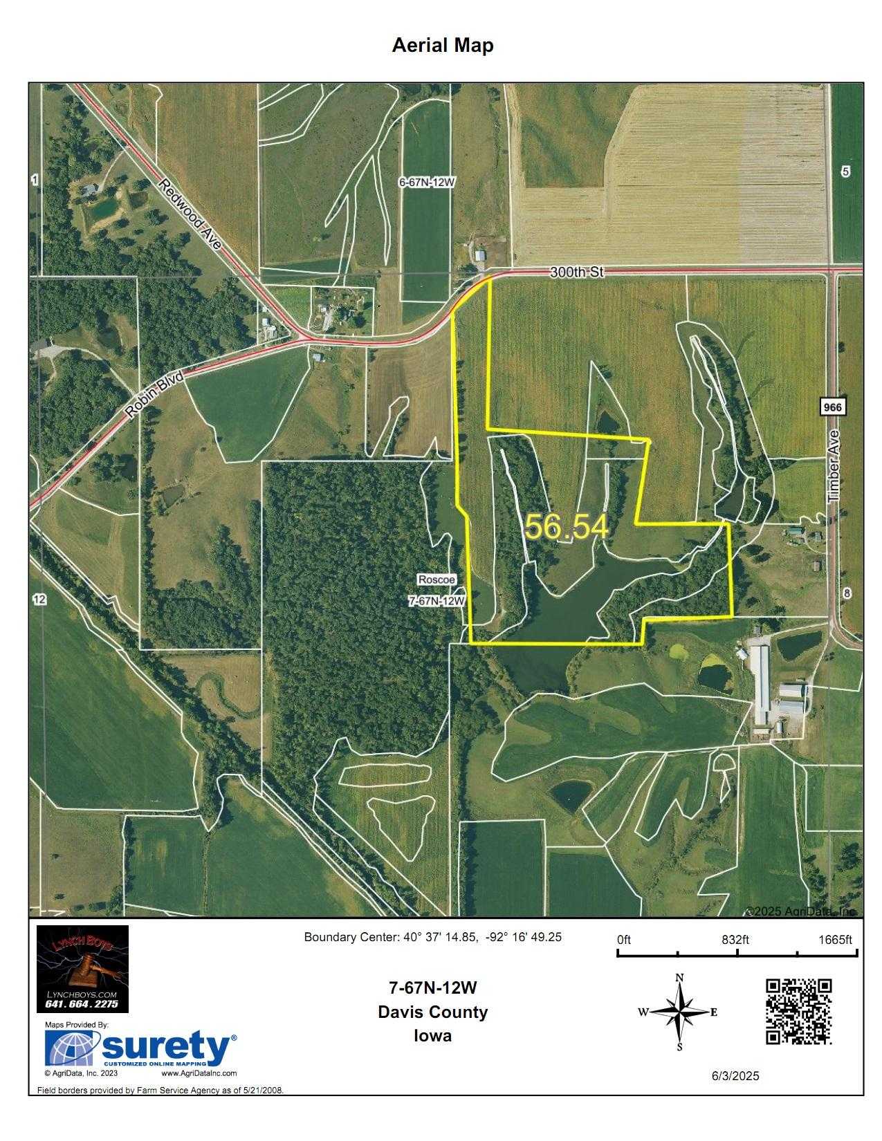 This is one of the most unique properties you will find on the market in Davis County Iowa. This property offers a secluded 11 acre stocked pond with over 2000' of a shared private driveway access with all utilities leading up to the 1 bedroom 650 sq ft cabin overlooking the water while sitting on 55 acres M/L subject to final survey this farm has a timber draw and 12 acres currently in row crop production with a average CSR2 of 50. There is a additional 87 acres M/L adjoining also available for sale to the west. Don't be the one that waits to long to look at this dream property.