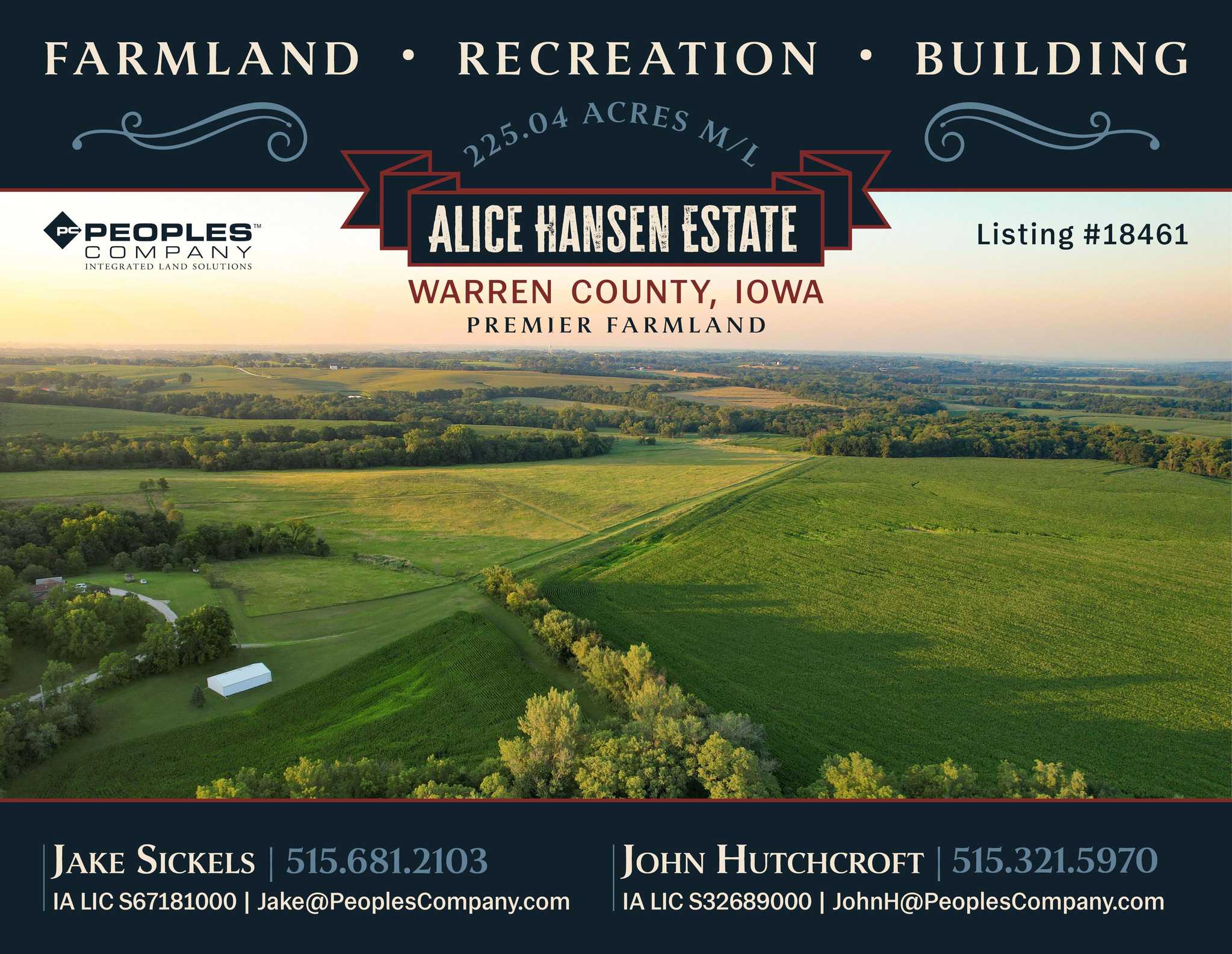 Peoples Company is proud to represent the Alice Joan Hansen Estate in the sale of 225.04 acres m/l of premium combination farmland, located in western Warren County, Iowa. Situated northeast of Martensdale and south of Norwalkjust five miles east of Interstate 35this farm has long been hidden behind the private gates at the end of Hempstead Place. Now, for the first time in decades, it is available to the public. The Hansen Farm presents an extraordinary opportunity to acquire productive agricultural land, exceptional recreational ground, beautiful potential building sites, and a level of privacy that is increasingly hard to find in Central Iowa.