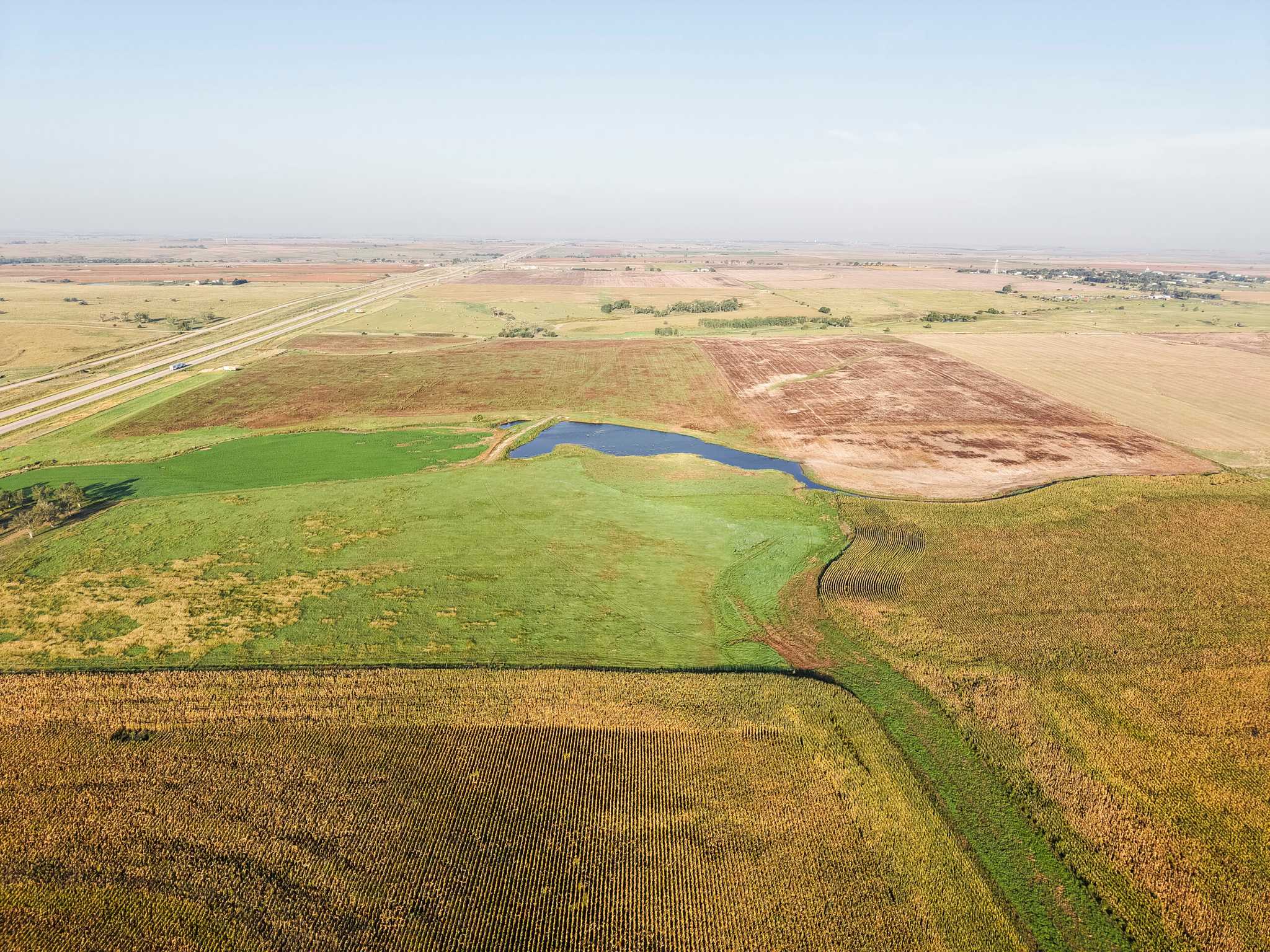 Convenient location, nearby utilities and a scenic 4 acre pond makes this an ideal building site. There is a water well and electricity already on site. Post Rock Rural Water District #4 water line runs through the land and fiber optic cable runs along 195th Street. Build closer to the outbuildings or near the pond. There are several outbuildings including a sizable red barn. A pipe corral is located just west of the barn and would work great for horses or small number of livestock. The driveway leading into the property is located less than 500 feet from Highway 40 and 2 miles from the on ramp of Interstate 70.