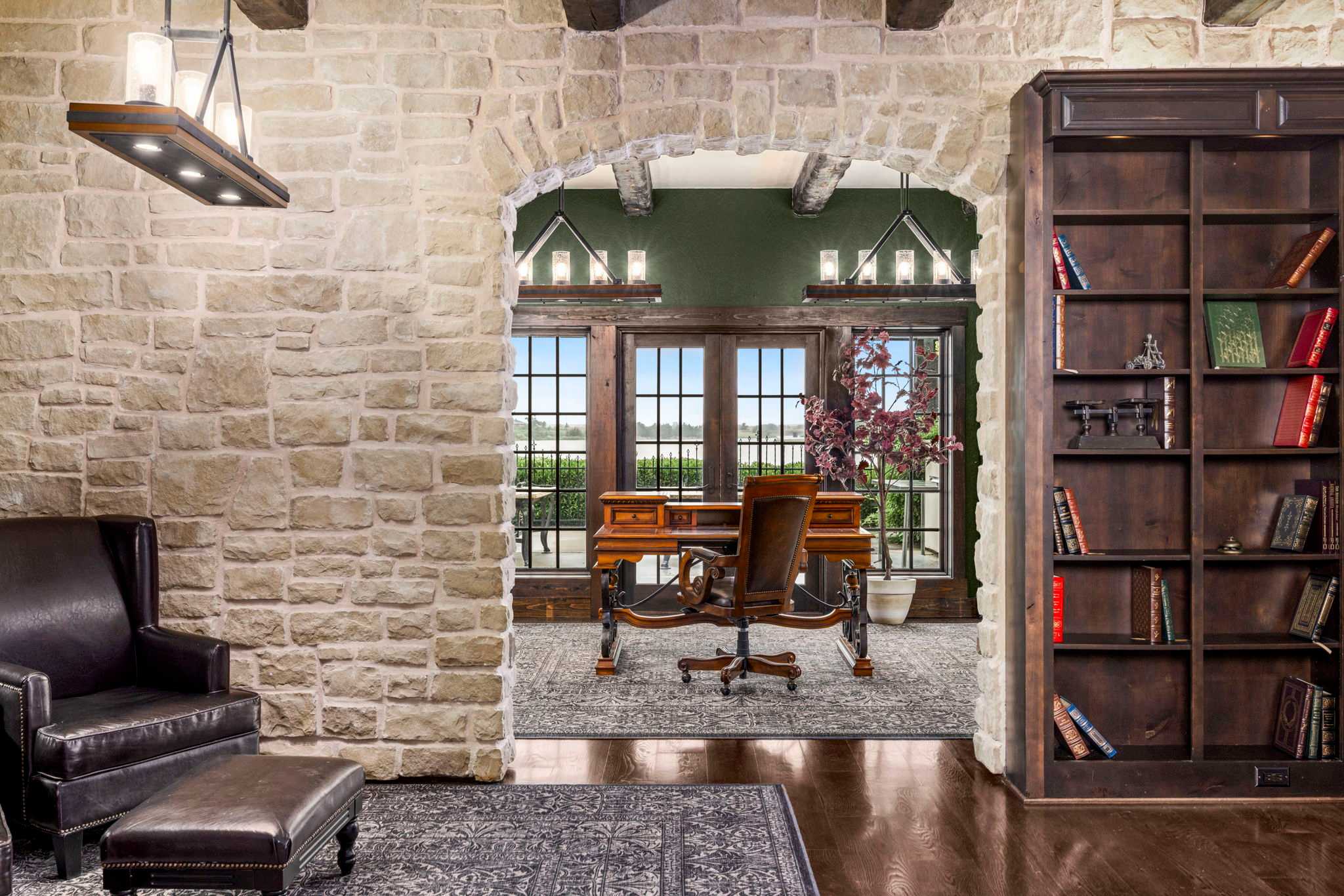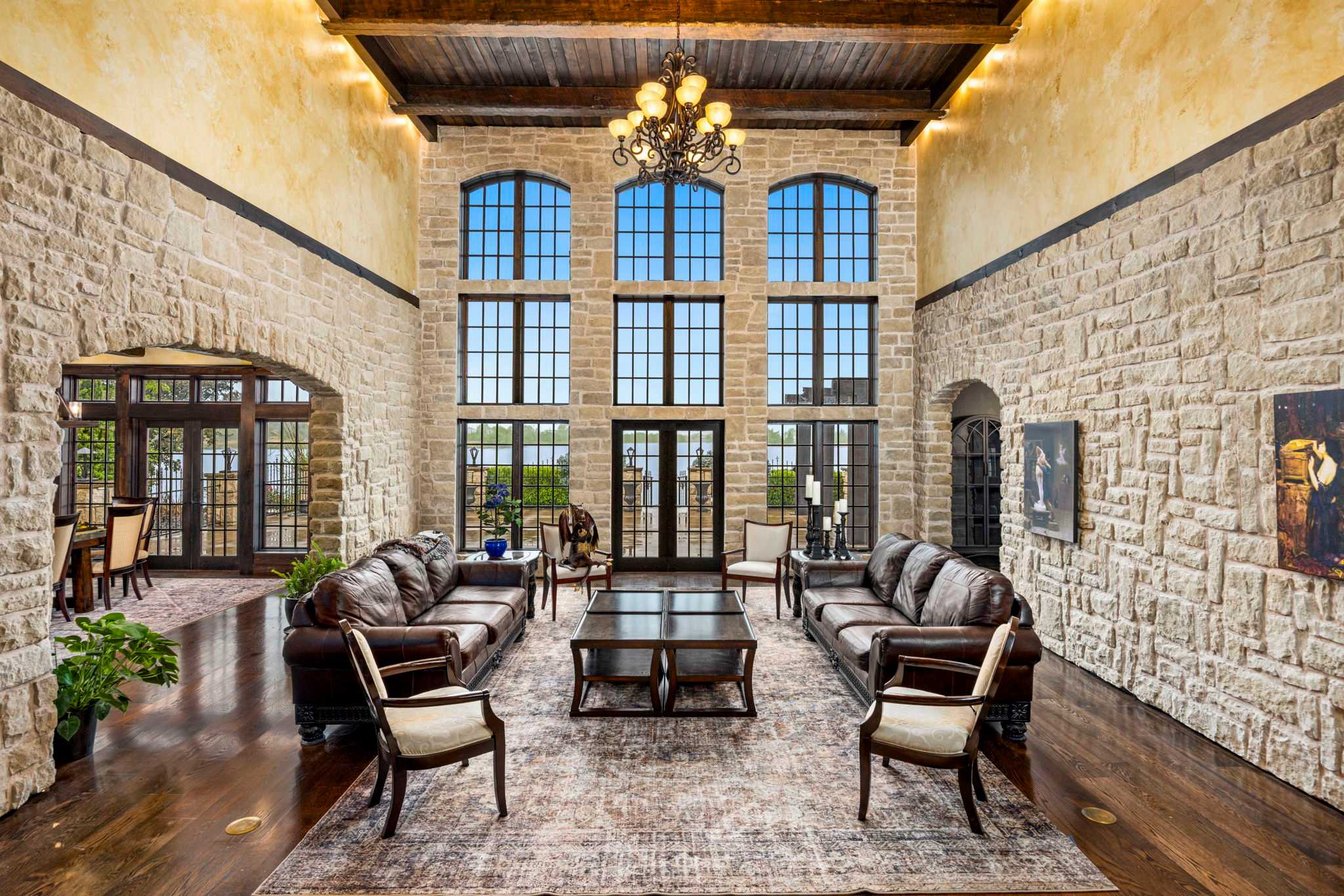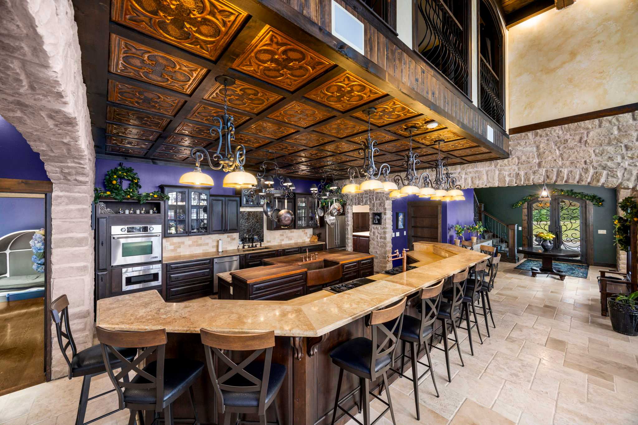 Step foot into this magnificent home where superior craftsmanship meets cutting-edge technology. Soaring 20-foot ceilings with hand-distressed wooden beams frame the Great Room, while the chef’s kitchen gleams beneath its distinctive copper-tile ceiling. Throughout the home, you’ll discover stone walls, arched openings, and Venetian plaster finishes that create an atmosphere of timeless elegance.