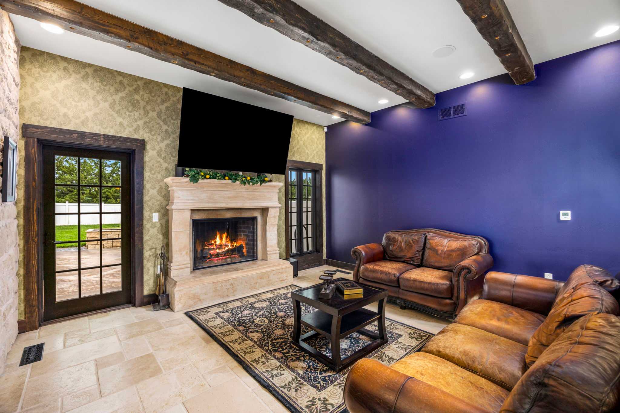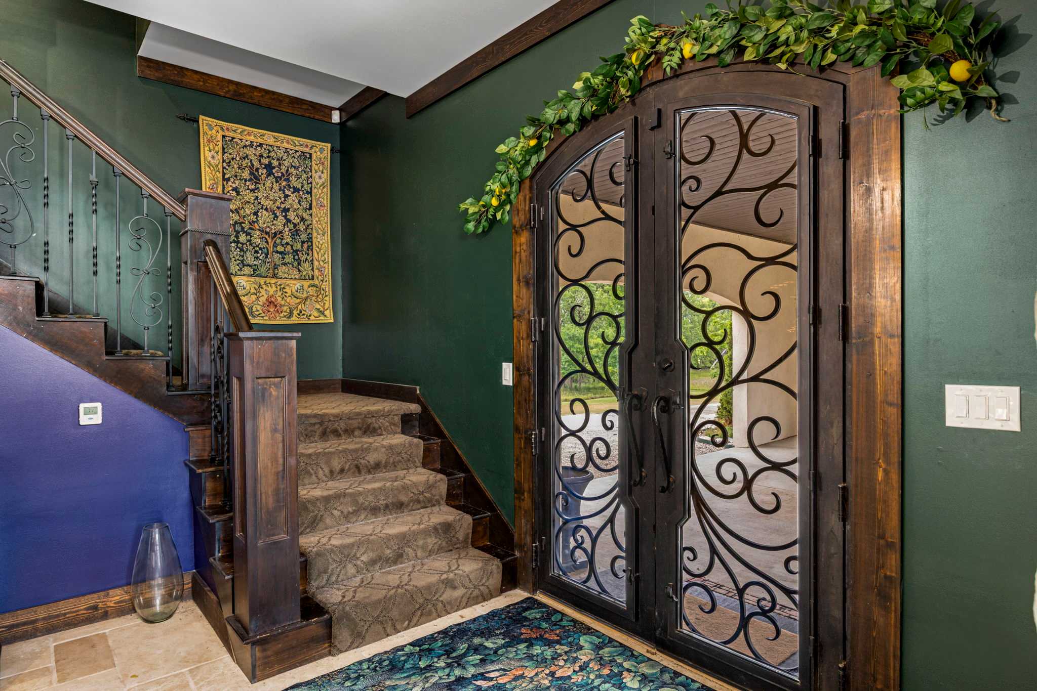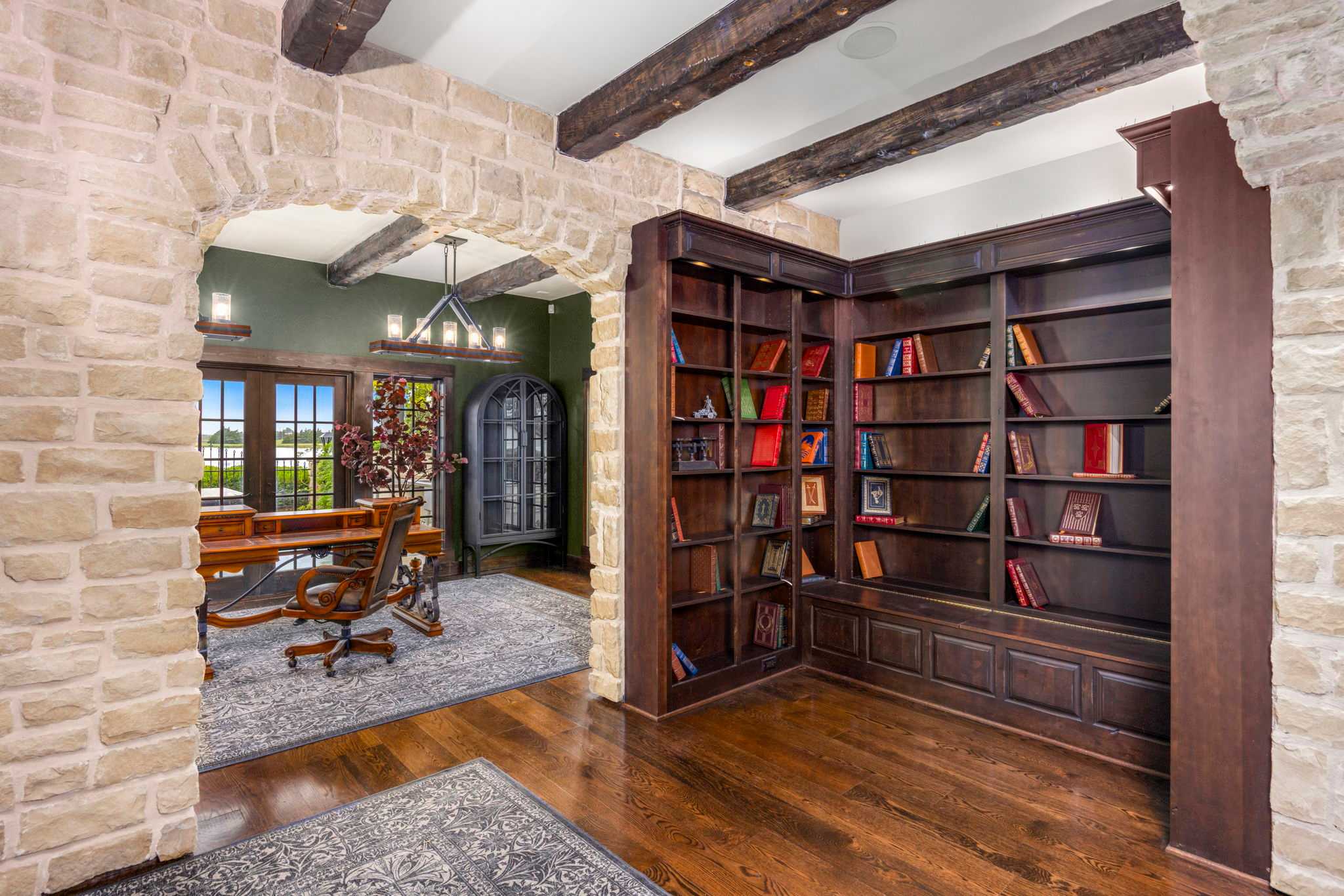 Step foot into this magnificent home where superior craftsmanship meets cutting-edge technology. Soaring 20-foot ceilings with hand-distressed wooden beams frame the Great Room, while the chef’s kitchen gleams beneath its distinctive copper-tile ceiling. Throughout the home, you’ll discover stone walls, arched openings, and Venetian plaster finishes that create an atmosphere of timeless elegance.