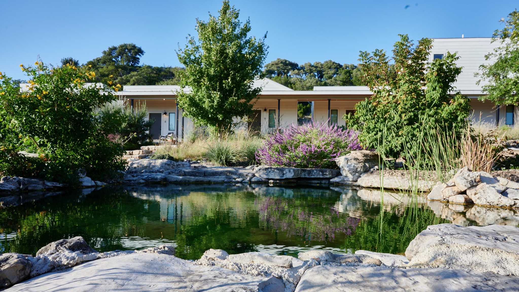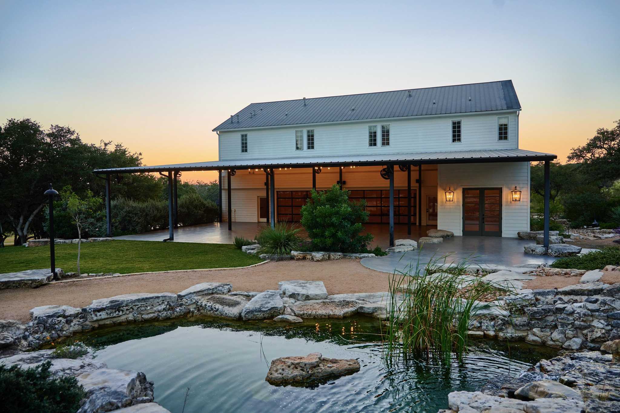 This striking, refurbished barn offers wood floors, antique beams, string lighting and a grand covered patio. Located in the lower pasture, it is surrounded by natural beauty and lush landscaping
