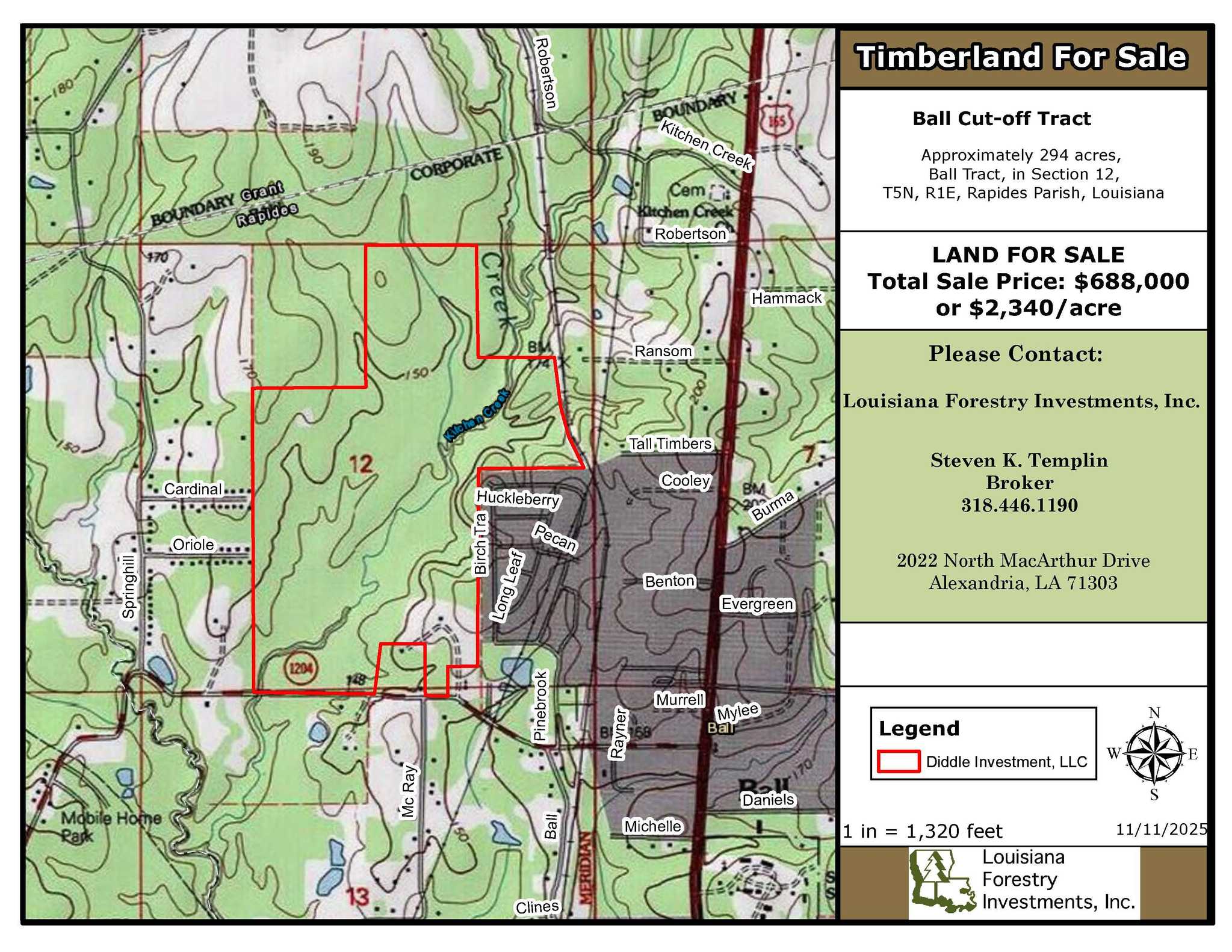 To truly appreciate this unique and beautiful tract, one must visit it in-person. The tract is easy to find: as you travel northward from Alexandria, Louisiana on Highway 165 North, you come to the community of Ball, Louisiana. This 294 acres is located on the north side of Ball. As you approach Ball Cut-Off Road (LA 1204) traveling northward, be prepared to take a left turn (west) at the red light. In one-half mile, you will see First Baptist Church of Ball on your right. Directly past this church, you will see the entrance to this property. There is a wire rope attached to two trees. Simply remove the rope from the hook and enter the property. NOTE: Please be aware of hunters during deer hunting season. This road will lead you through a picturesque pine stand as it winds northward. It will end at a deer hunting feeding area. You may walk by foot anywhere on the property from this point, as the walking is relatively easy and accessible. Be aware a beautiful creek called Kitchen Creek winds its way through the property but can be carefully crossed at select points. This tract is the perfect example of exceptional and diverse potential, containing countless hardwood species and pine stands. An investment here could produce a future community/subdivision, a golf course, or a hunting paradise as examples. This property is situated close enough to Highway 165 North for commerce as well as secluded enough for outstanding hunting potential or subdivision development. Not to mention the hardwood and pine timber will make an excellent harvest in years to come. Dont miss this exciting investment opportunity.